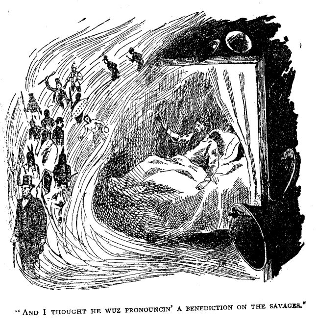 Wall, Josiah slept some, or that is, I s'poze he did. I didn't hear much from him from 10 P.M. to 5 A.M., only once I heard him murmer in his sleep, "buzz saw mill."
