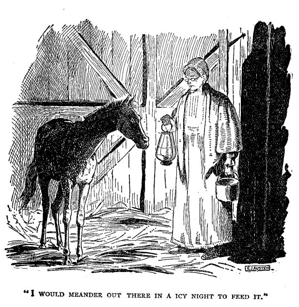 He'd wake up, a-layin' there warm and comfortable on his soft goose feather piller and say to me: "Been out to tend to your 'horse corset,' have you?"