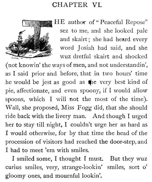 Again it come to pass, in the fulness of time, that my companion, Josiah Allen, see me walk up and take my ink stand off of the manteltry piece, and carry it with a calm and majestick gait to the corner of the settin' room table devoted by me to literary pursuits. And he sez to me: