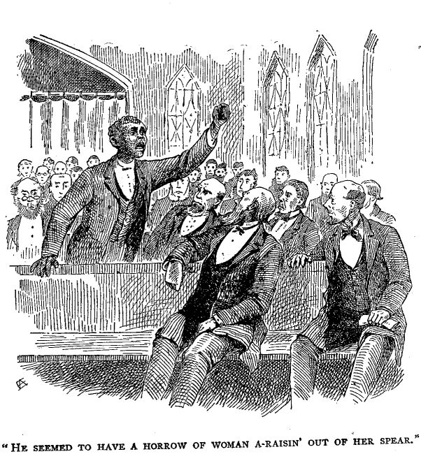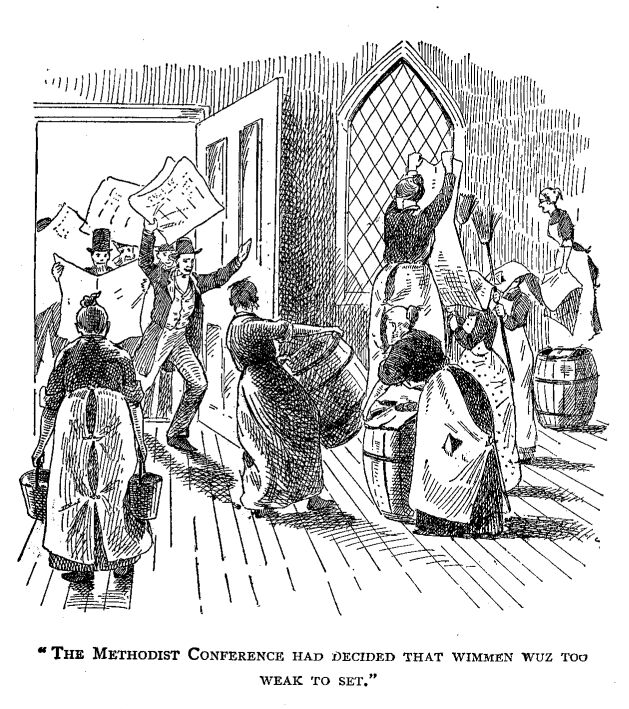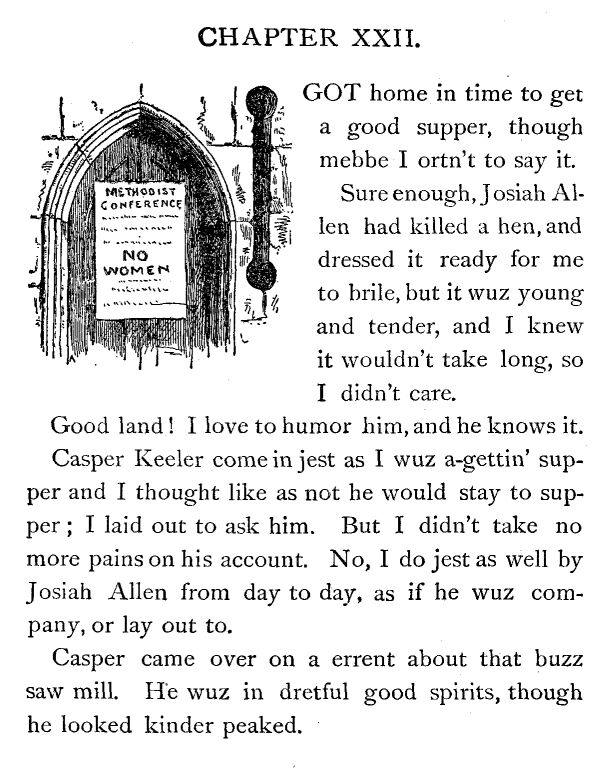 Sez I, “She wuz in the wrong on't in not lettin' wimmen set on the Conference.”