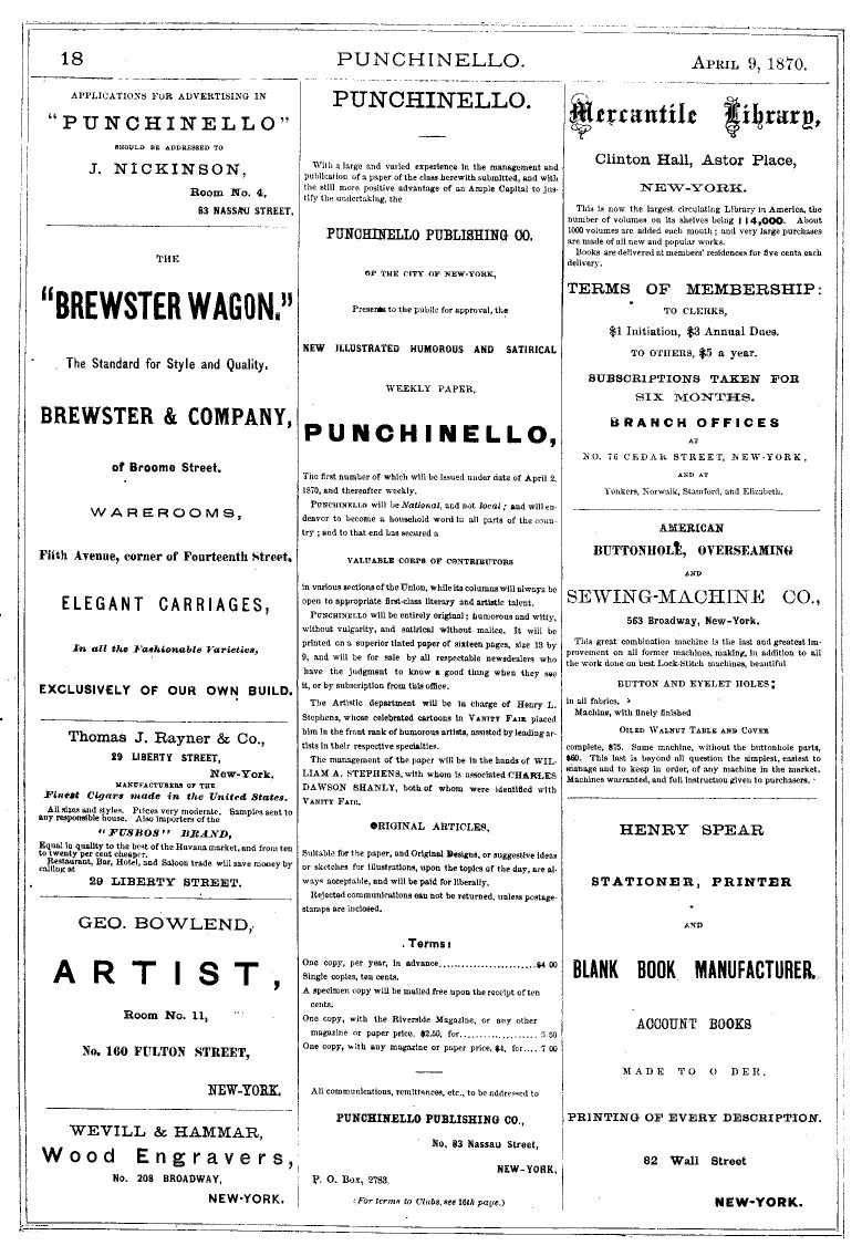 Harper's Periodicals. Magazine. Weekly. Bazar. Subscription Price, $4 per year each. $10 for the three. An Extra Copy of either the MAGAZINE, WEEKLY, or BAZAR will be supplied HARPER'S CATALOGUE May be obtained gratuitously on application to Harper & Brothers HARPER & BROTHERS, New-York. HENRY L. STEPHENS, ARTIST, No. 160 Fulton Street, NEW-YORK. Important to Newsdealers! ALL ORDERS FOR PUNCHINELLO Will be supplied by OUR SOLE ANB EXCLUSIVE AGENTS, American News Co. NEW-YORK. PUNCHINELLO: TERMS TO CLUBS. WE OFFER AS PREMIUMS FOR CLUBS FIRST: DANA BICKFORD'S PATENT FAMILY SPINNER, The most complete and desirable machine ever yet introduced for spinning SECOND: BICKFORD'S CROCHET AND FANCY WORK MACHINES.