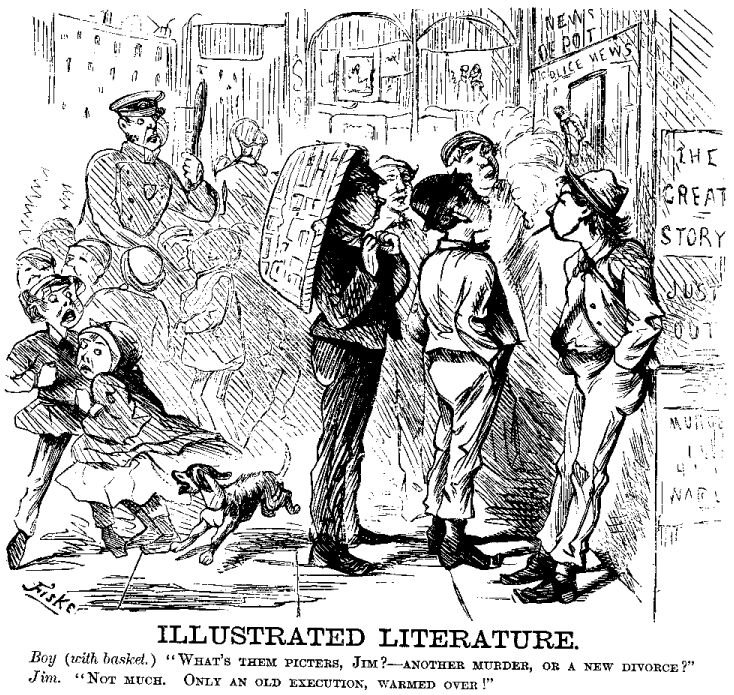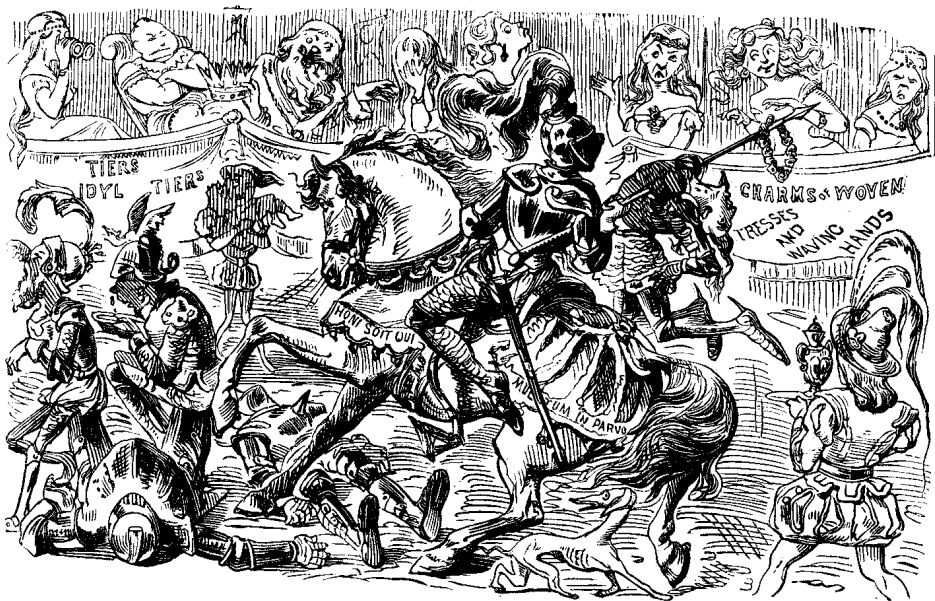 [The American Press's Young Gentlemen, when taking their shady literary walks among the Columns of Interesting Matter, have been known to remark—with a glibness and grace, by Jove, greatly in excess of their salaries—that the reason why we don't produce great works of imagination in this country, as they do in other countries, is because we haven't the genius, you know. They think—do they?—that the bran-new localities, post-office addresses, and official titles, characteristic of the United States of America, are rife with all the grand old traditional suggestions so useful in helping along the romantic interest of fiction. They think—do they?—that if an American writer could write a Novel in the exact style of COLLINS, or TROLLOPE, or DICKENS: only laying its scenes and having its characters in this country; the work would be as romantically effective as one by COLLINS, or TROLLOPE, or DICKENS; and that the possibly necessary incidental mention of such native places as Schermerhorn Street, Dobb's Ferry, or Chicago, wouldn't disturb the nicest dramatic illusion of the imaginative tale. Very well, then! All right! Just look here!—O A.P's Young Gentlemen, just look here—]