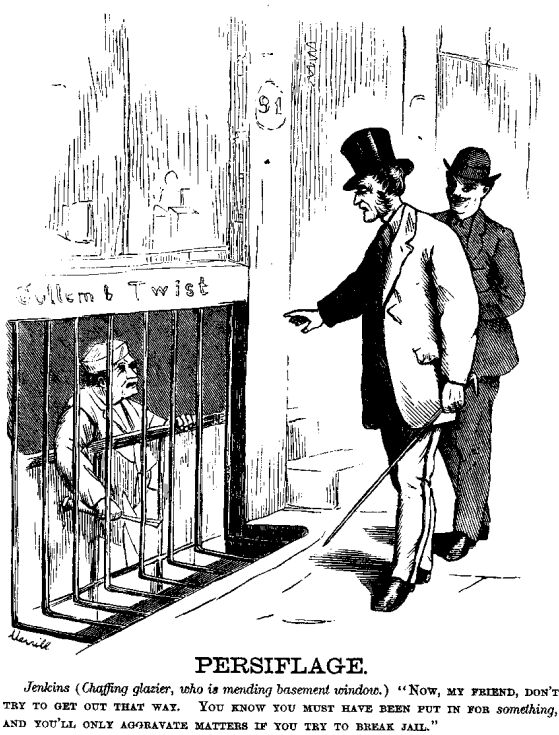 Jenkins (Chaffing glazier, who is mending basement window.) "NOW, MY FRIEND, TRY TO GET OUT THAT WAY. YOU KNOW YOU MUST HAVE BEEN PUT IN FOR something, AND YOU'LL ONLY AGGRAVATE MATTERS IF YOU TRY TO BREAK JAIL."]