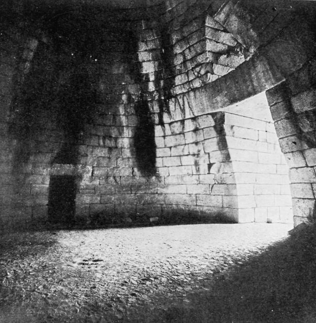 No wonder the untaught modern Greeks thought that this was a giants' oven, where the giants baked their bread. But learned men have shown that it was connected with a tomb, and that in this room the men of Mycenae worshipped their dead. It was very wonderfully made and beautifully ornamented. The big stone over the doorway was nearly thirty feet long, and weighs a hundred and twenty tons. Men came to this beehive tomb in the old days of Mycenae, down a long passage with a high stone wall on either side. The doorway was decorated with many-colored marbles and beautiful bronze plates. The inside was ornamented, too, and there was an altar in there.