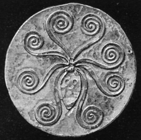 At Mycenae were found seven hundred and one large round plates of gold, decorated with cuttlefish, flowers, butterflies, and other designs.