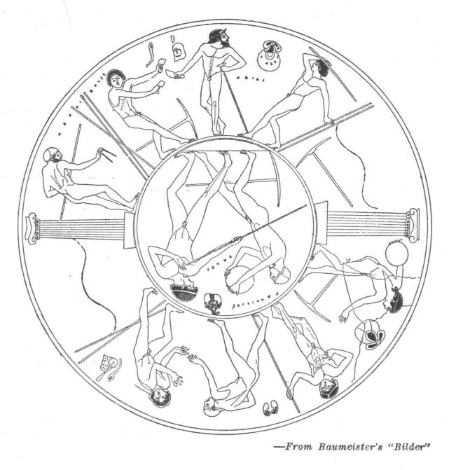 From a vase painting. They are wrestling, jumping with weights, throwing