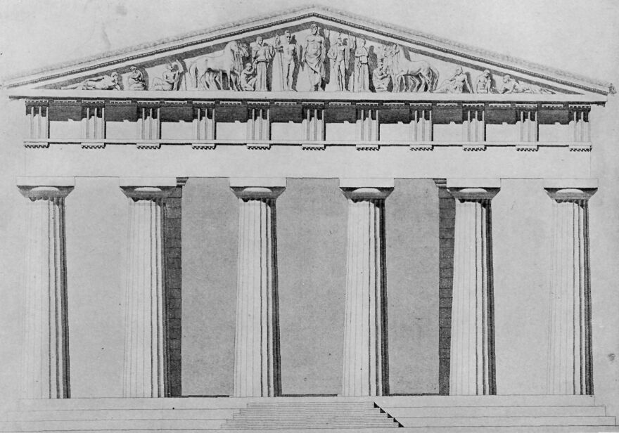 When we see a picture of fallen broken columns lying about a field in disorder, we try to learn how the original building looked and to imagine it in all its beauty. This, men believe, is the way the Temple of Zeus looked. The figures in the pediment were all of Parian marble. In the center stands Zeus himself. A chariot race is about to be run, and the contestants stand on either side of Zeus. Zeus gave the victory to Pelops, and Pelops became husband of Hippodameia, and king of Pisa, and founded the Olympic Games. These games were held every fourth year for more than a thousand years.