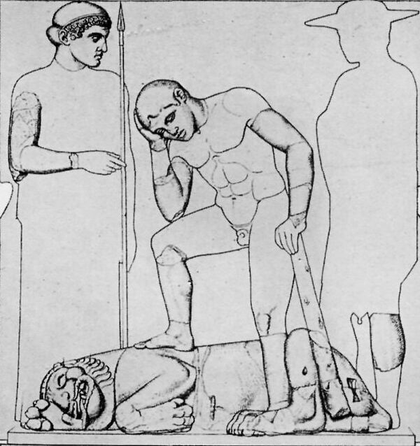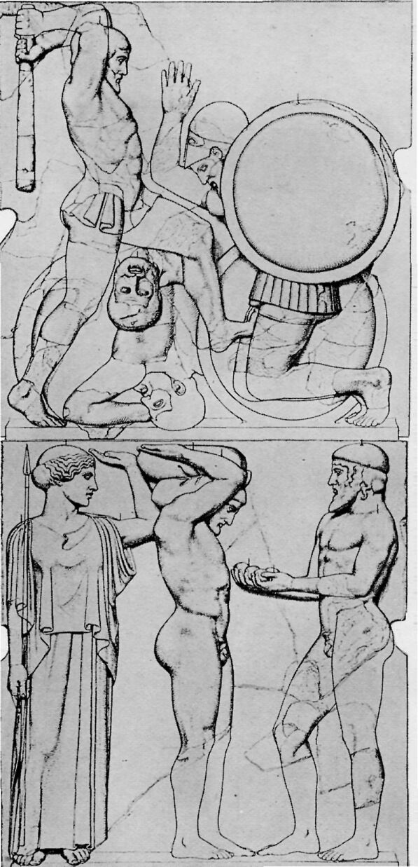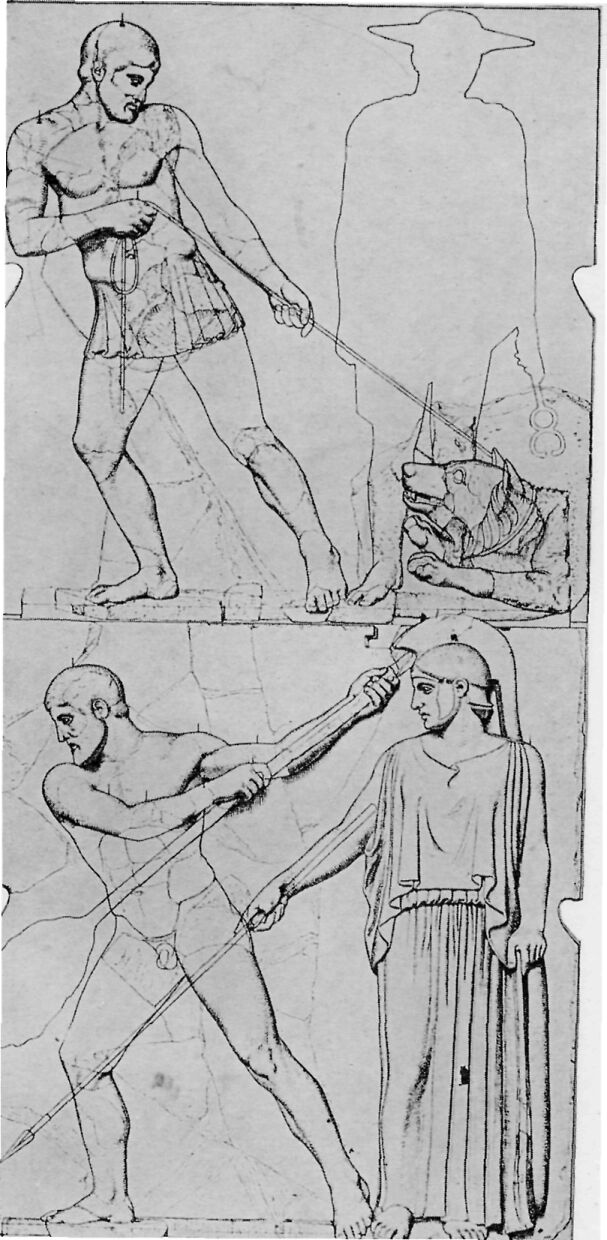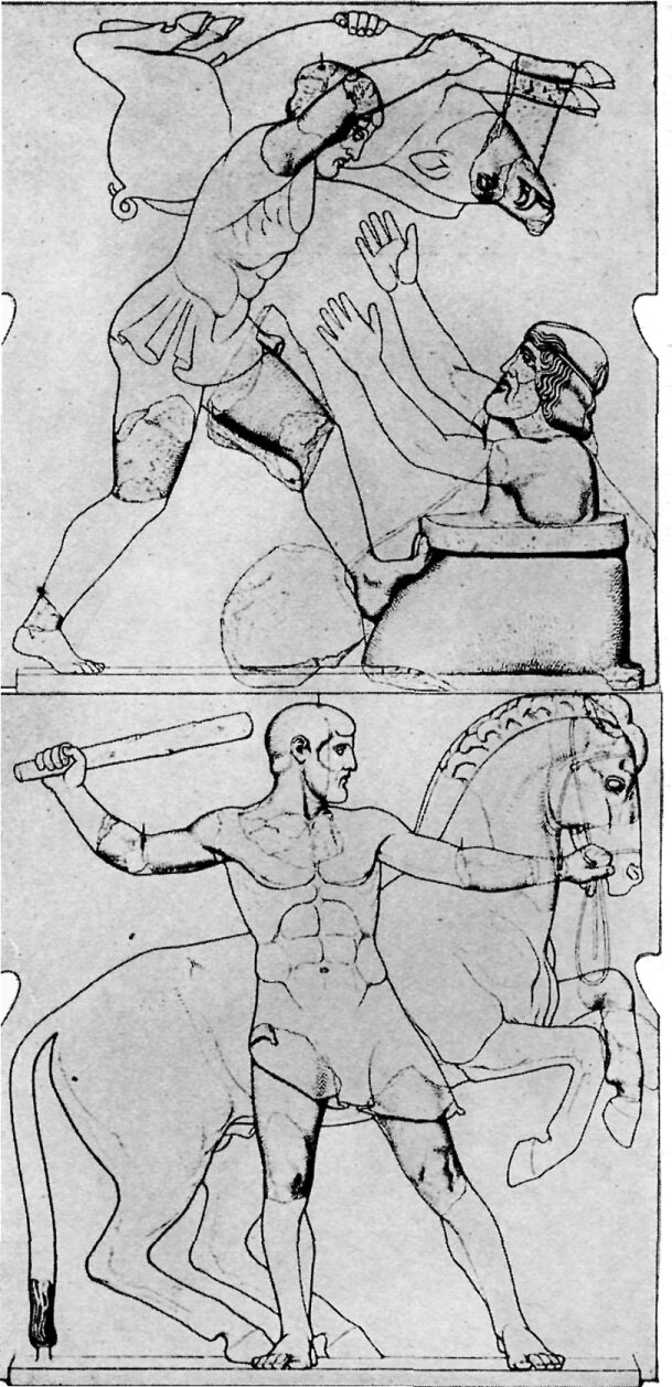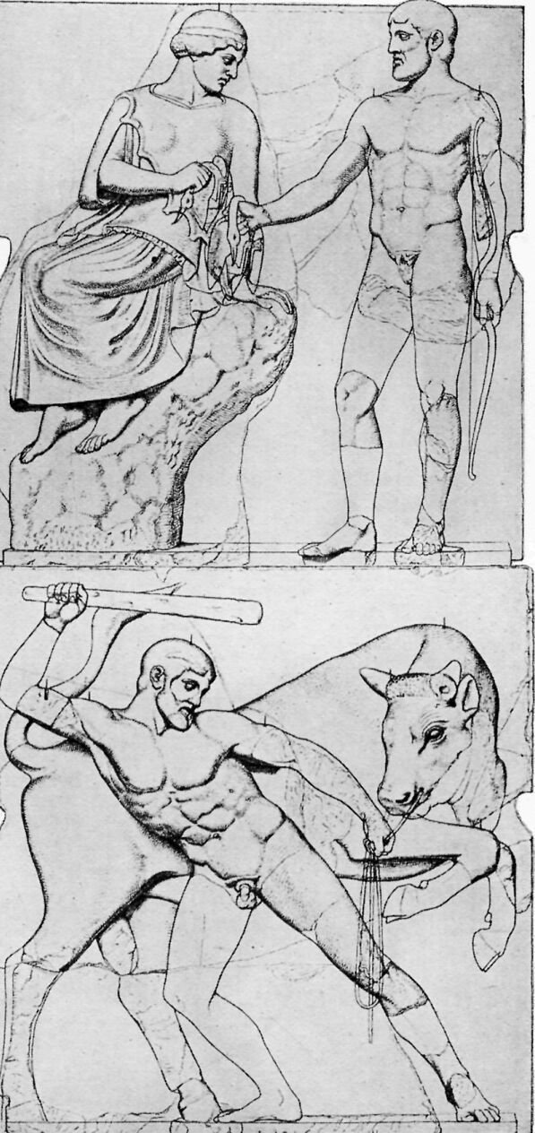 Under the porches of the Temple of Zeus were twelve pictures in marble, six at each end, showing the Labors of Herakles. Herakles was highly honored at Olympia and, according to one tale, he, instead of Pelops, was the founder of the Olympic Games.