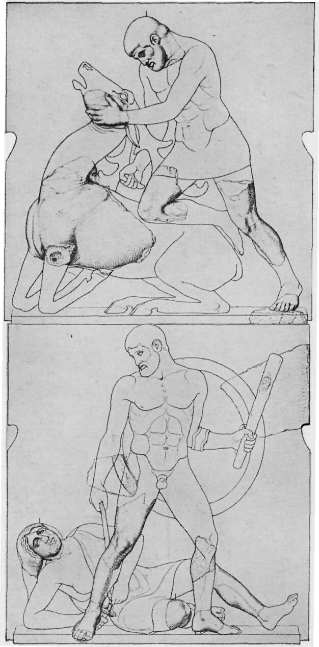 Note: This and the following plates of the Labors of Herakles and the statue of Victory, were photographed from Curtius and Adler’s “Olympia: Die Ergebnisse der von dem Deutschen Reich Veranstalteten Ausgrabung,” etc. This is one of the most beautiful books ever made for a buried city.