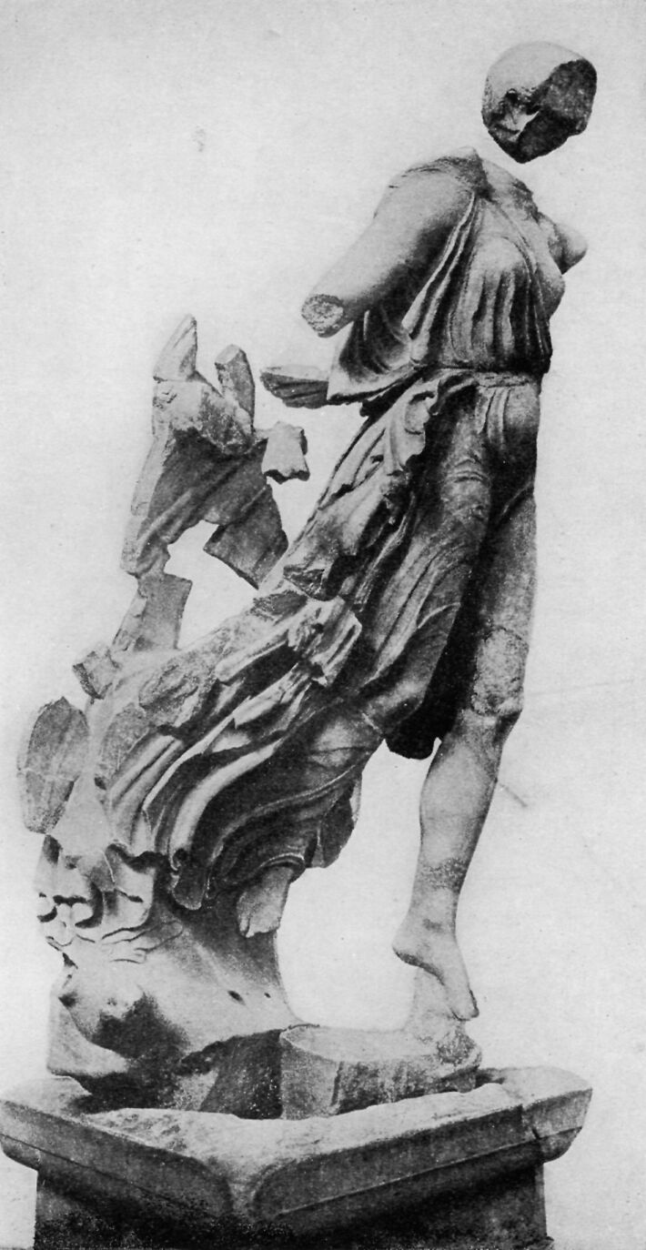 In the sand, not far from the Temple of Zeus, the explorers found the fragments of this statue. It shows the goddess flying down from heaven to bring victory to the men of Messene and Naupaktos. So the victors must have erected this statue at Olympia in gratitude.