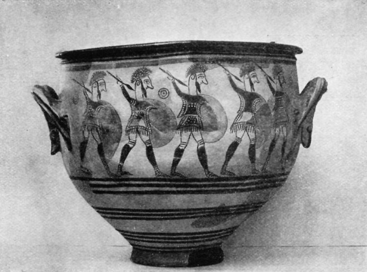This vase was made of clay and baked. Then the artist painted figures on it with colored earth. This was so long ago that men had not learned to draw very well, but we like the vase because the potter made it such a beautiful shape, and because we learn from it how the warriors of early Mycenae dressed. Under their armor they wore short chitons with fringe at the bottom, and long sleeves, and they carried strangely shaped shields and short spears or long lances. Do you think those are knapsacks tied to the lances?