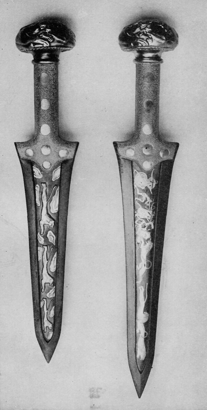 It would take a very skilfull man to-day, a man who was both goldsmith and artist, to make such daggers as men found at Mycenae. First the blade was made. Then the artist took a separate sheet of bronze for his design. This sheet he enamelled, and on it he inlaid his design. On one of these daggers we see five hunters fighting three lions. Two of the lions are running away. One lion is pouncing upon a hunter, but his friends are coming to help him. If you could turn this dagger over, you would see a lion chasing five gazelles. The artist used pure gold for the bodies of the hunters and the lions; he used electron, an alloy of gold and silver, for the hunters’ shields and their trousers; and he made the men’s hair, the lions’ manes, and the rims of the shields, of some black substance. When the picture was finished on the plate, he set the plate into the blade, and riveted on the handle. On the smaller dagger we see three lions running.