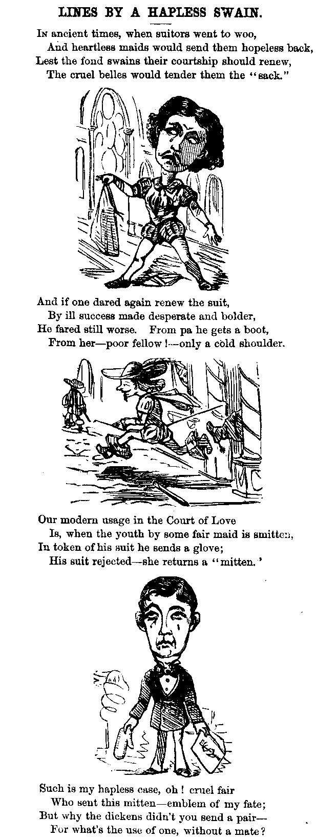 "Thank you, sir, I'd make better time alone. When you came up, sir, Old Mortarity was meditating on this bone-farm," says Mr. MCLAUGHLIN, pointing with a trowel, which he had drawn from his pocket, into the pauper burial-ground. "He was thinking of the many laid here when the Alms-House over yonder used to be open as a Alms-House. I've patched up all these graves, as well as them in the Ritual churchyard, and know 'em all, sir. Over there, Editor of Country Journal; next, Stockholder in Erie; next, Gentleman who Undertook to be Guided in His Agriculture by Mr. GREELEY'S 'What I Know about Farming;' next, Original Projector of American Punch; next, Proprietor of Rural Newspaper; next, another Projector of American Punch—indeed, all the rest of that row is American Punches; next, Conductor of Rustic Daily; next, Manager of Italian Opera; next, Stockholder in Morris and Essex; next, American Novelist; next, Husband of Literary Woman; next, Pastor of Southern Church; next, Conductor of Provincial Press.—I know 'em ALL sir," says Old Mortarity, with exquisite pathos, "and if a flower could spring up for every tear a friendless old man has dropped upon their neglected graves, you couldn't see the wooden head-boards for the roses."