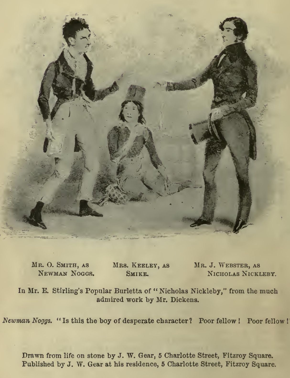 It was a by-street, and there was nobody about, or in the few wretched shops they passed. Making towards a faint gleam of light which streamed across the pavement from a cellar, Nicholas was about to descend two or three steps so as to render himself visible to those below and make his inquiry, when he was arrested by a loud noise of scolding in a woman’s voice.