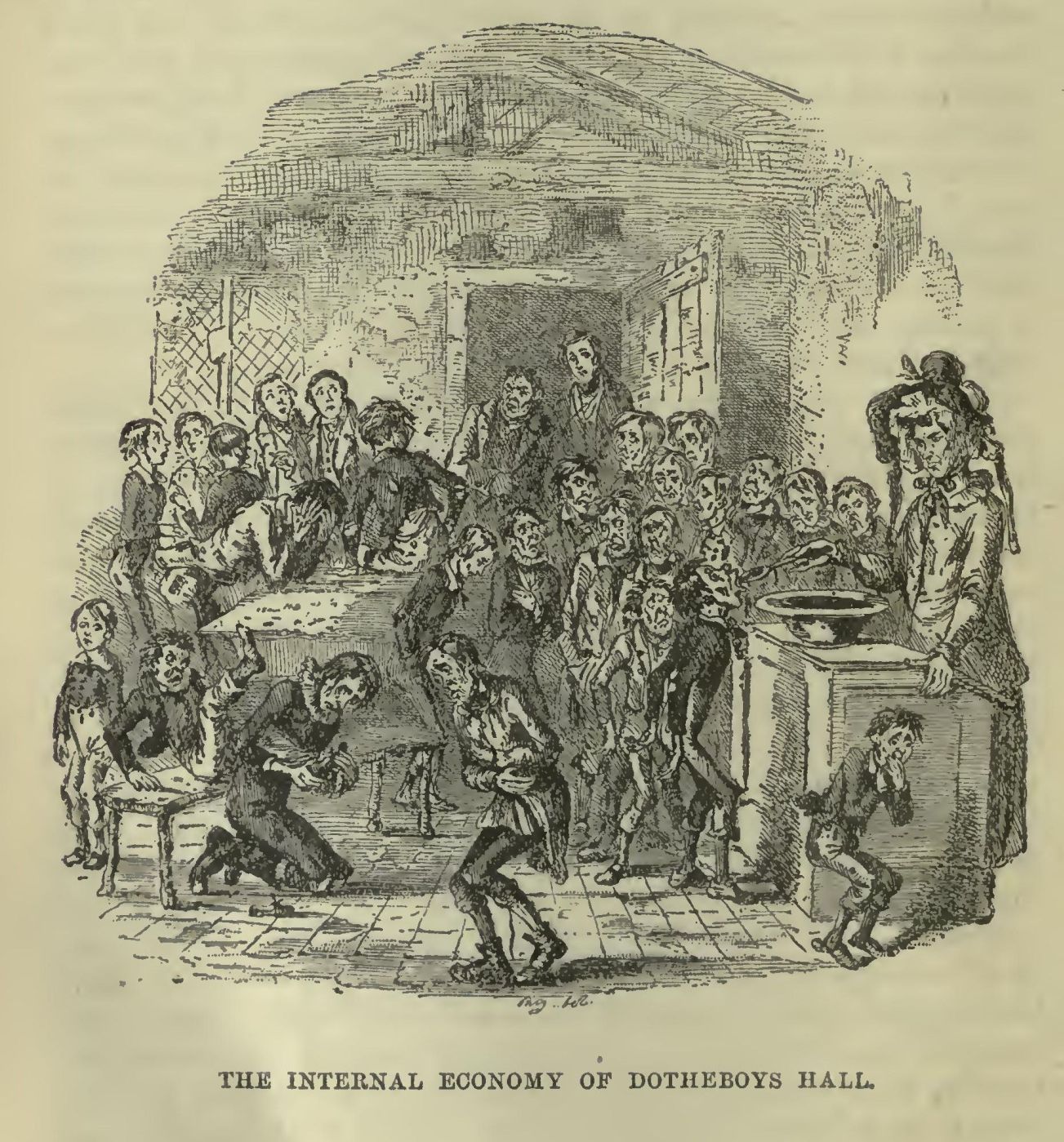It was one of the brimstone-and-treacle mornings, and Mrs. Squeers had entered school according to custom with the large bowl and spoon, followed by Miss Squeers and the amiable Wackford: who, during his father’s absence, had taken upon him such minor branches of the executive as kicking the pupils with his nailed boots, pulling the hair of some of the smaller boys, pinching the others in aggravating places, and rendering himself, in various similar ways, a great comfort and happiness to his mother. Their entrance, whether by premeditation or a simultaneous impulse, was the signal of revolt. While one detachment rushed to the door and locked it, and another mounted on the desks and forms, the stoutest (and consequently the newest) boy seized the cane, and confronting Mrs Squeers with a stern countenance, snatched off her cap and beaver bonnet, put them on his own head, armed himself with the wooden spoon, and bade her, on pain of death, go down upon her knees and take a dose directly. Before that estimable lady could recover herself, or offer the slightest retaliation, she was forced into a kneeling posture by a crowd of shouting tormentors, and compelled to swallow a spoonful of the odious mixture, rendered more than usually savoury by the immersion in the bowl of Master Wackford’s head, whose ducking was intrusted to another rebel. The success of this first achievement prompted the malicious crowd, whose faces were clustered together in every variety of lank and half-starved ugliness, to further acts of outrage. The leader was insisting upon Mrs. Squeers repeating her dose, Master Squeers was undergoing another dip in the treacle, and a violent assault had been commenced on Miss Squeers, when John Browdie, bursting open the door with a vigorous kick, rushed to the rescue. The shouts, screams, groans, hoots, and clapping of hands, suddenly ceased, and a dead silence ensued.