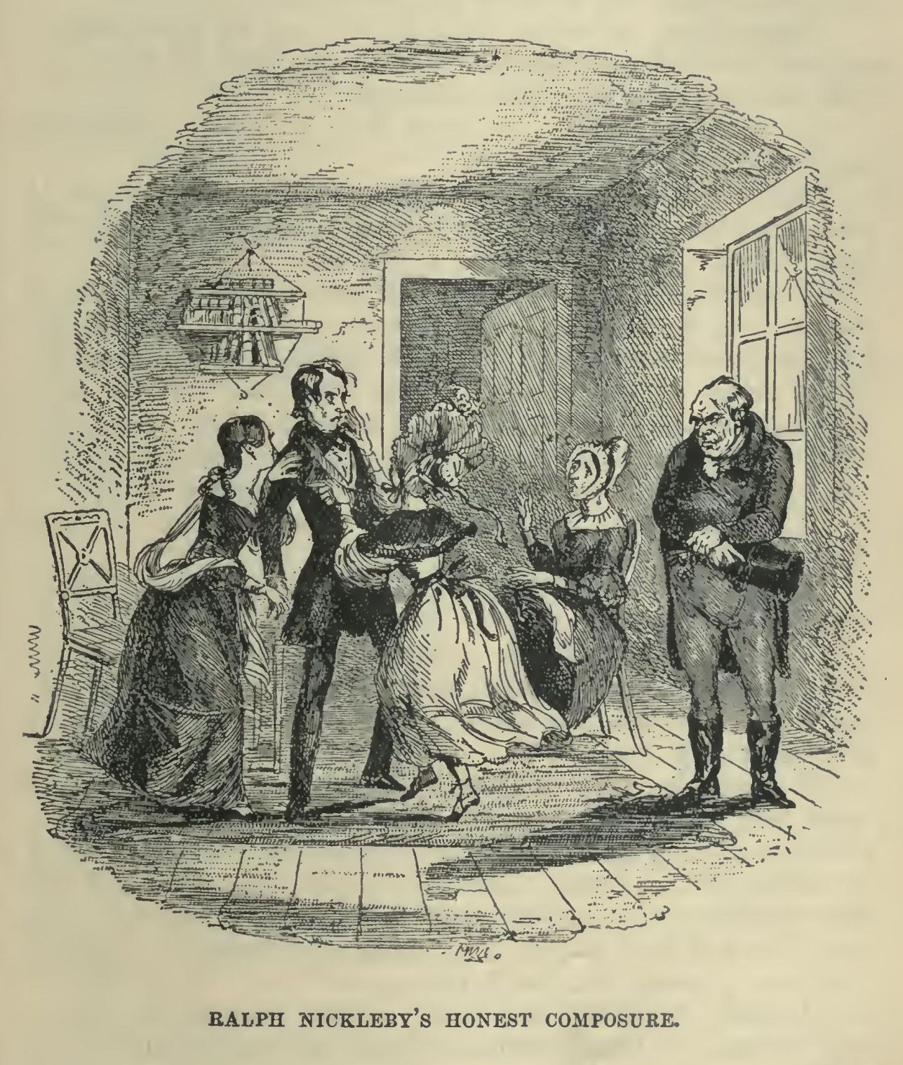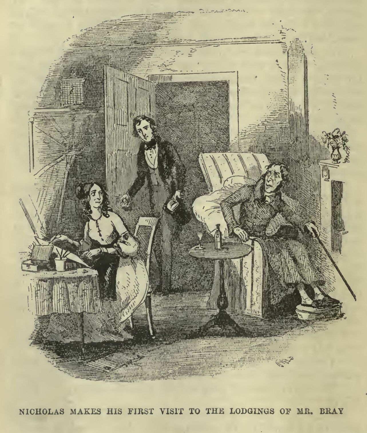 ‘Demmit,’ he cried, in a suffocating voice, ‘it’s little Nickleby! Shut the door, put out the candle, turn me up in the bedstead! Oh, dem, dem, dem!’