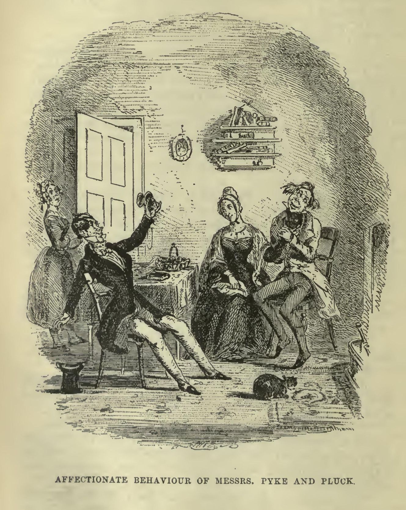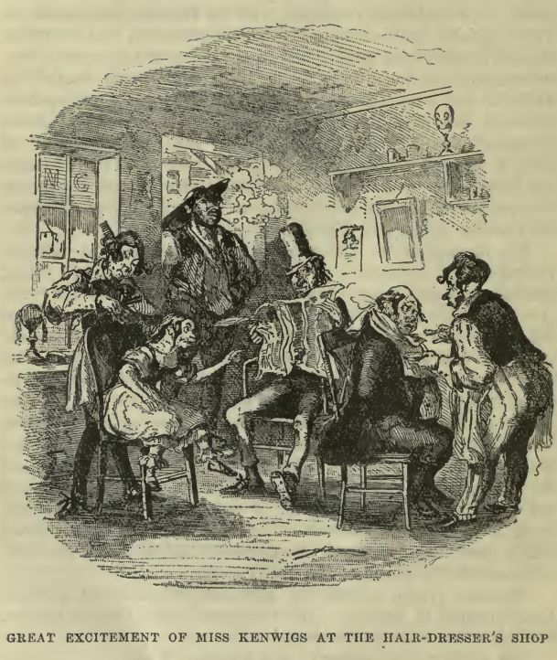 The new-comers were received with universal approbation, and Mr. Bonney bustled up to the top of the table, took off his hat, ran his fingers through his hair, and knocked a hackney-coachman’s knock on the table with a little hammer: whereat several gentlemen cried ‘Hear!’ and nodded slightly to each other, as much as to say what spirited conduct that was. Just at this moment, a waiter, feverish with agitation, tore into the room, and throwing the door open with a crash, shouted ‘Sir Matthew Pupker!’