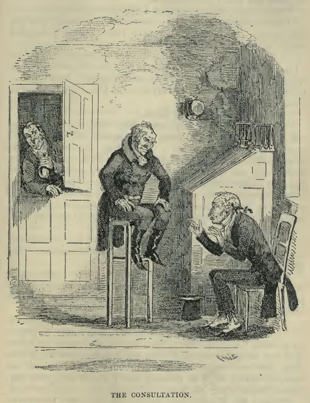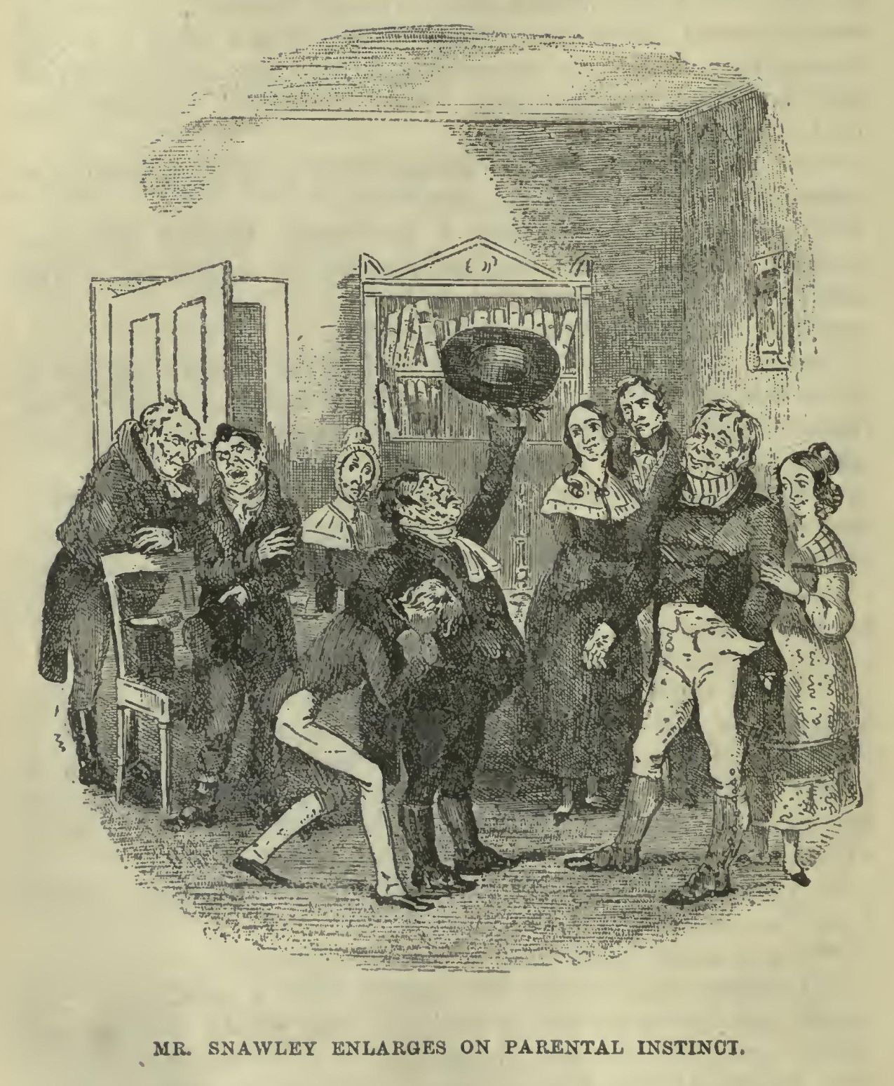 The committee stood up and clapped their hands for joy, and while they were clapping them, in came Sir Matthew Pupker, attended by two live members of Parliament, one Irish and one Scotch, all smiling and bowing, and looking so pleasant that it seemed a perfect marvel how any man could have the heart to vote against them. Sir Matthew Pupker especially, who had a little round head with a flaxen wig on the top of it, fell into such a paroxysm of bows, that the wig threatened to be jerked off, every instant. When these symptoms had in some degree subsided, the gentlemen who were on speaking terms with Sir Matthew Pupker, or the two other members, crowded round them in three little groups, near one or other of which the gentlemen who were not on speaking terms with Sir Matthew Pupker or the two other members, stood lingering, and smiling, and rubbing their hands, in the desperate hope of something turning up which might bring them into notice. All this time, Sir Matthew Pupker and the two other members were relating to their separate circles what the intentions of government were, about taking up the bill; with a full account of what the government had said in a whisper the last time they dined with it, and how the government had been observed to wink when it said so; from which premises they were at no loss to draw the conclusion, that if the government had one object more at heart than another, that one object was the welfare and advantage of the United Metropolitan Improved Hot Muffin and Crumpet Baking and Punctual Delivery Company.