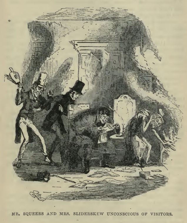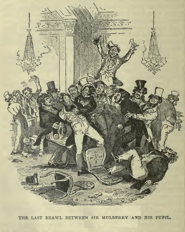 Mrs. Sliderskew went beyond the seas at nearly the same time as Mr. Squeers, and in the course of nature never returned. Brooker died penitent. Sir Mulberry Hawk lived abroad for some years, courted and caressed, and in high repute as a fine dashing fellow. Ultimately, returning to this country, he was thrown into jail for debt, and there perished miserably, as such high spirits generally do.