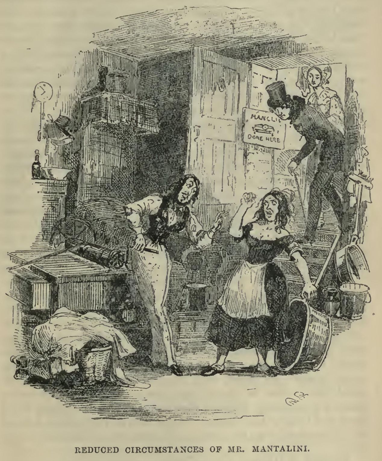 Drawing her after him, Nicholas crept down the steps and looked into a small boarded cellar. There, amidst clothes-baskets and clothes, stripped up to his shirt-sleeves, but wearing still an old patched pair of pantaloons of superlative make, a once brilliant waistcoat, and moustache and whiskers as of yore, but lacking their lustrous dye—there, endeavouring to mollify the wrath of a buxom female—not the lawful Madame Mantalini, but the proprietress of the concern—and grinding meanwhile as if for very life at the mangle, whose creaking noise, mingled with her shrill tones, appeared almost to deafen him—there was the graceful, elegant, fascinating, and once dashing Mantalini.
