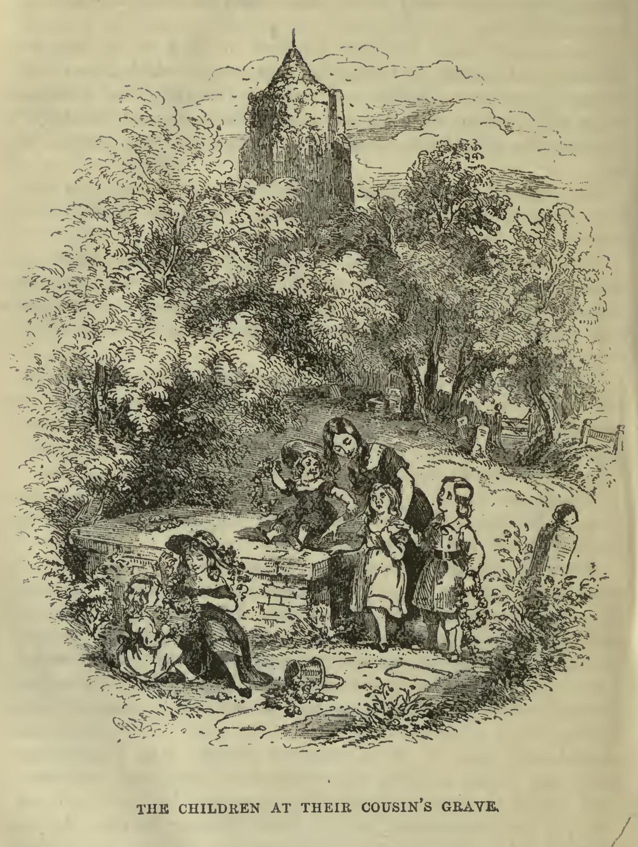 The grass was green above the dead boy’s grave, and trodden by feet so small and light, that not a daisy drooped its head beneath their pressure. Through all the spring and summertime, garlands of fresh flowers, wreathed by infant hands, rested on the stone; and, when the children came to change them lest they should wither and be pleasant to him no longer, their eyes filled with tears, and they spoke low and softly of their poor dead cousin.