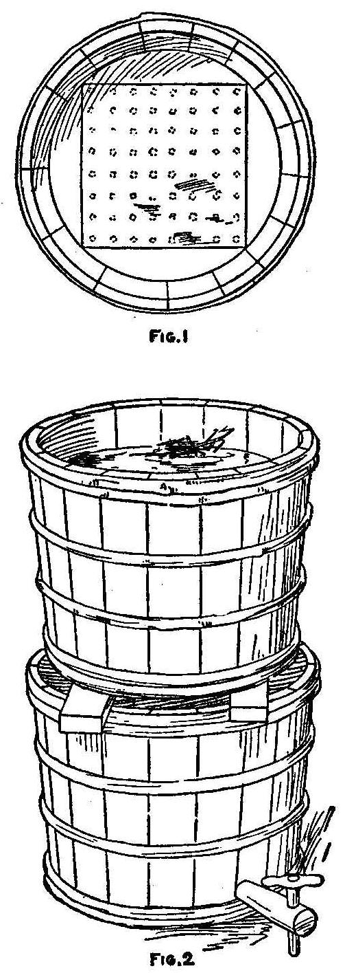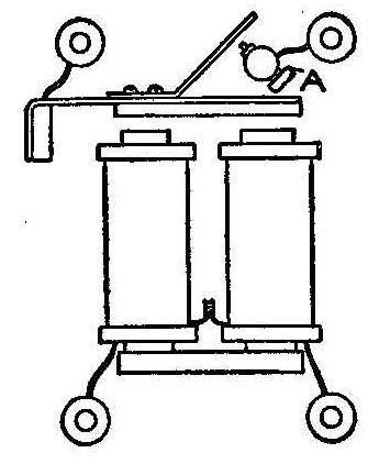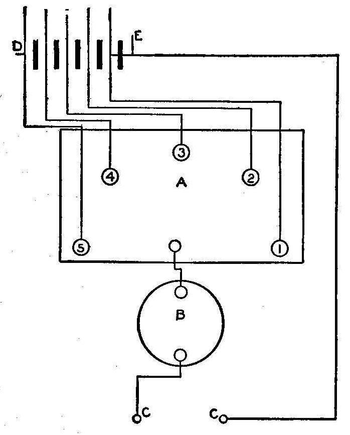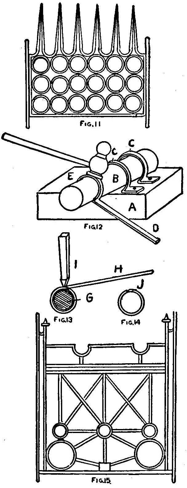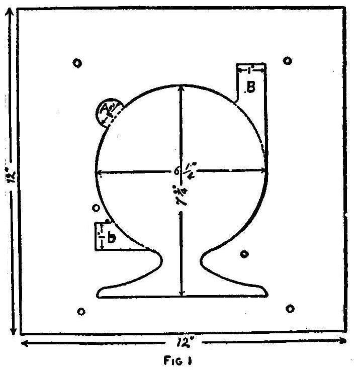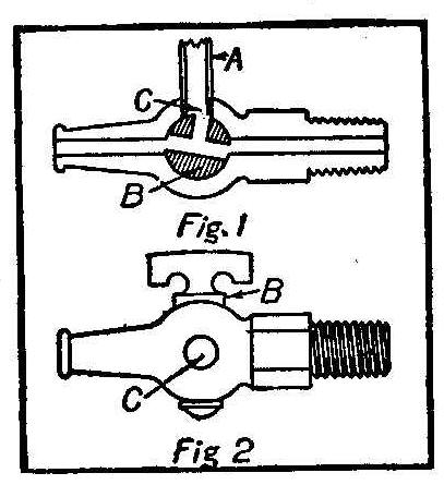 The valves, C, and their seats, B, bored with a countersink bit, are plainly shown. The valves were made by threading a copper washer, 3/8 in. in diameter, and screwing it on the end of the valve rod, then wiping on roughly a tapered mass of solder and grinding it into the seats B with emery and oil.