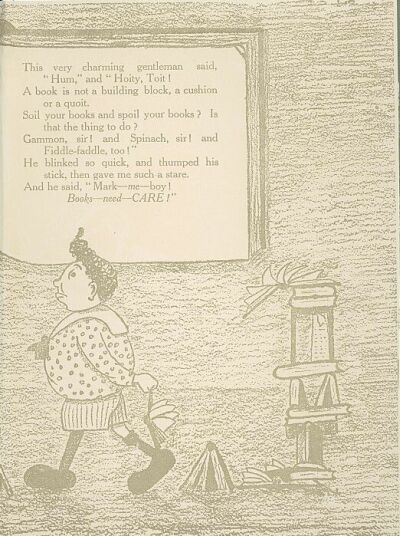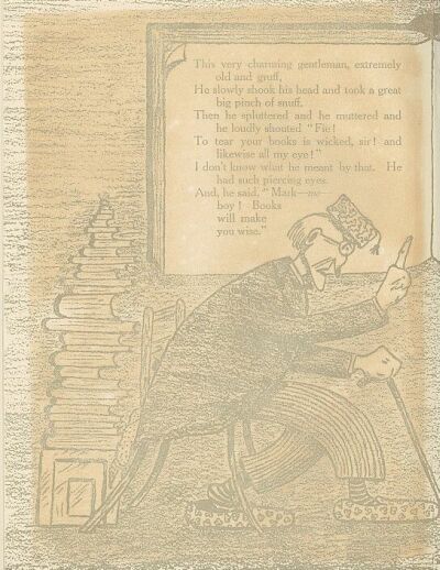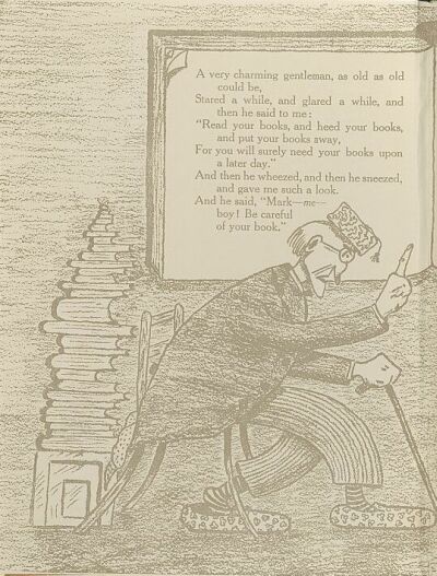 A very charming gentleman, as old as old could be, Stared a while, and glared a while, and then he said to me: "Read your books, and heed your books, and put your books away, For you will surely need your books upon a later day." And then he wheezed and then he sneezed, and gave me such a look. And he said, "Mark--ME--boy! Be careful of your book." A very charming gentleman, indeed, he seemed to be. He heaved a sigh and wiped his eye, and then he said to me: "Take your books and make your books companions--never toys; For they who so forsake their books grow into gawky boys." I don't know who he was. Do you? he snuffled at the end; And he said, "Mark--ME--boy! Your book should be your friend."