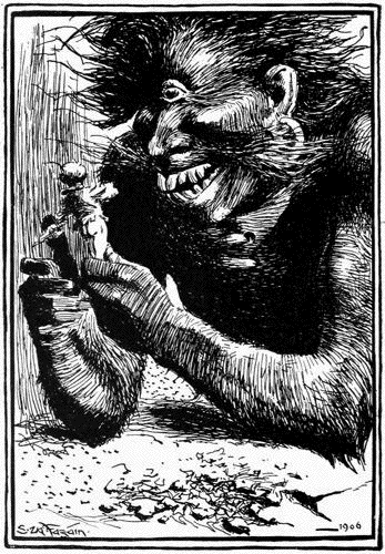 Then they sat down to table, and the fairy rang the little brass bell twice, and the weeny dwarf brought in two boiled snails in their shells, and when they had eaten the snails he brought in a dormouse, and when they had eaten the dormouse he brought in two wrens, and when they had eaten the wrens he brought in two nuts full of wine, and they became very merry, and the fairyman sang “Cooleen dhas,” and the dwarf sang “The little blackbird of the glen.”