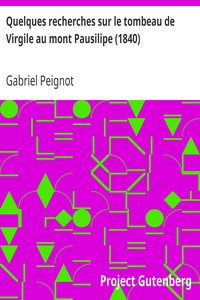 "Quelques recherches sur le tombeau de Virgile au mont Pausilipe" by G. Peignot is a scholarly publication written in the early 19th century. This work investigates the historical and archaeological significance of the purported tomb of the ancient poet Virgil, examining various scholarly opinions and historical accounts related to its origins. The text delves into the legends surrounding the site and the various honors that have been paid to Virgil's memory over