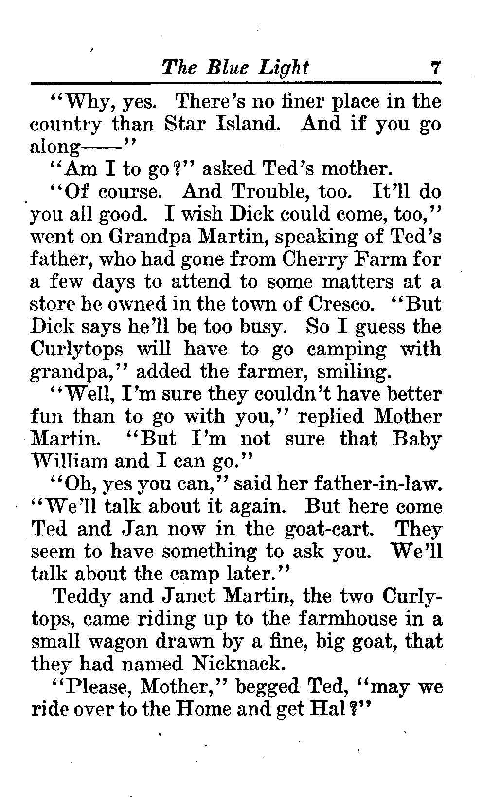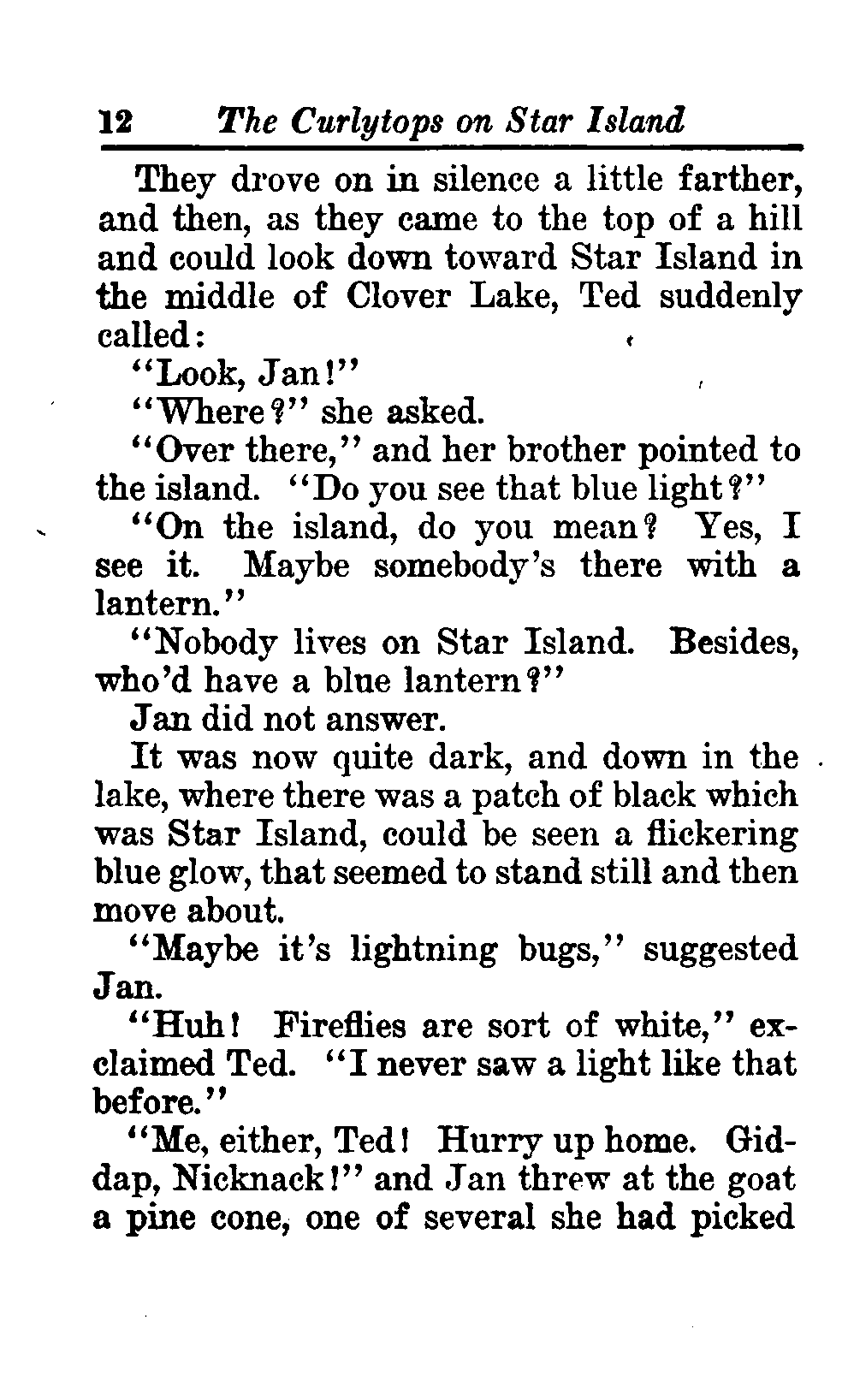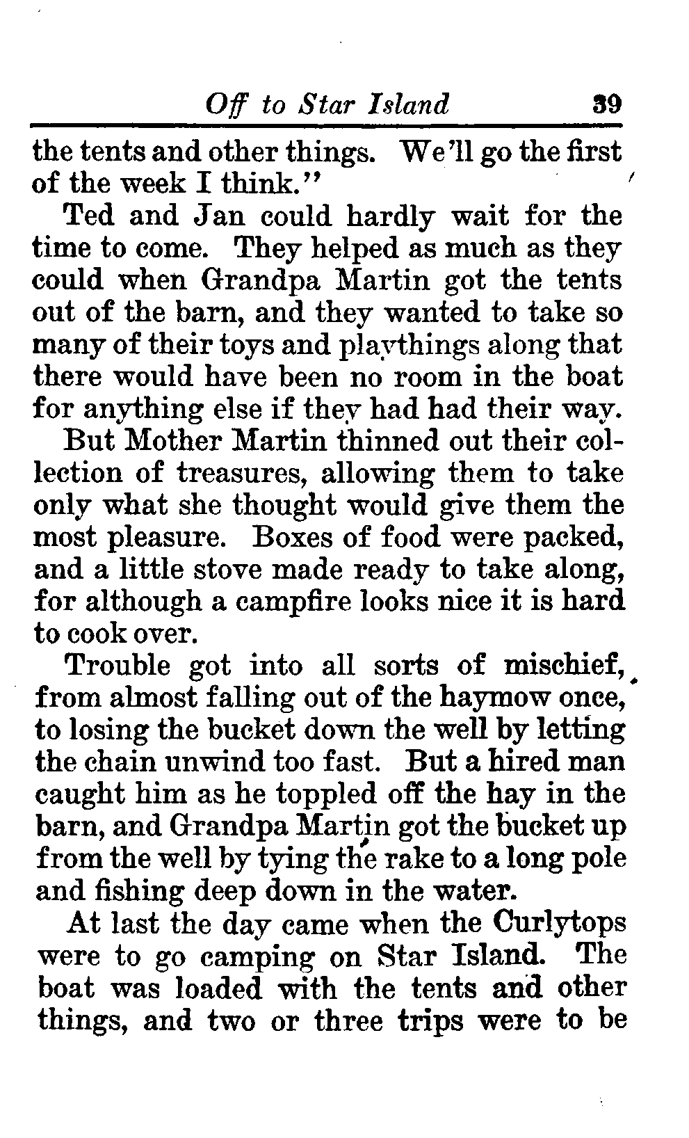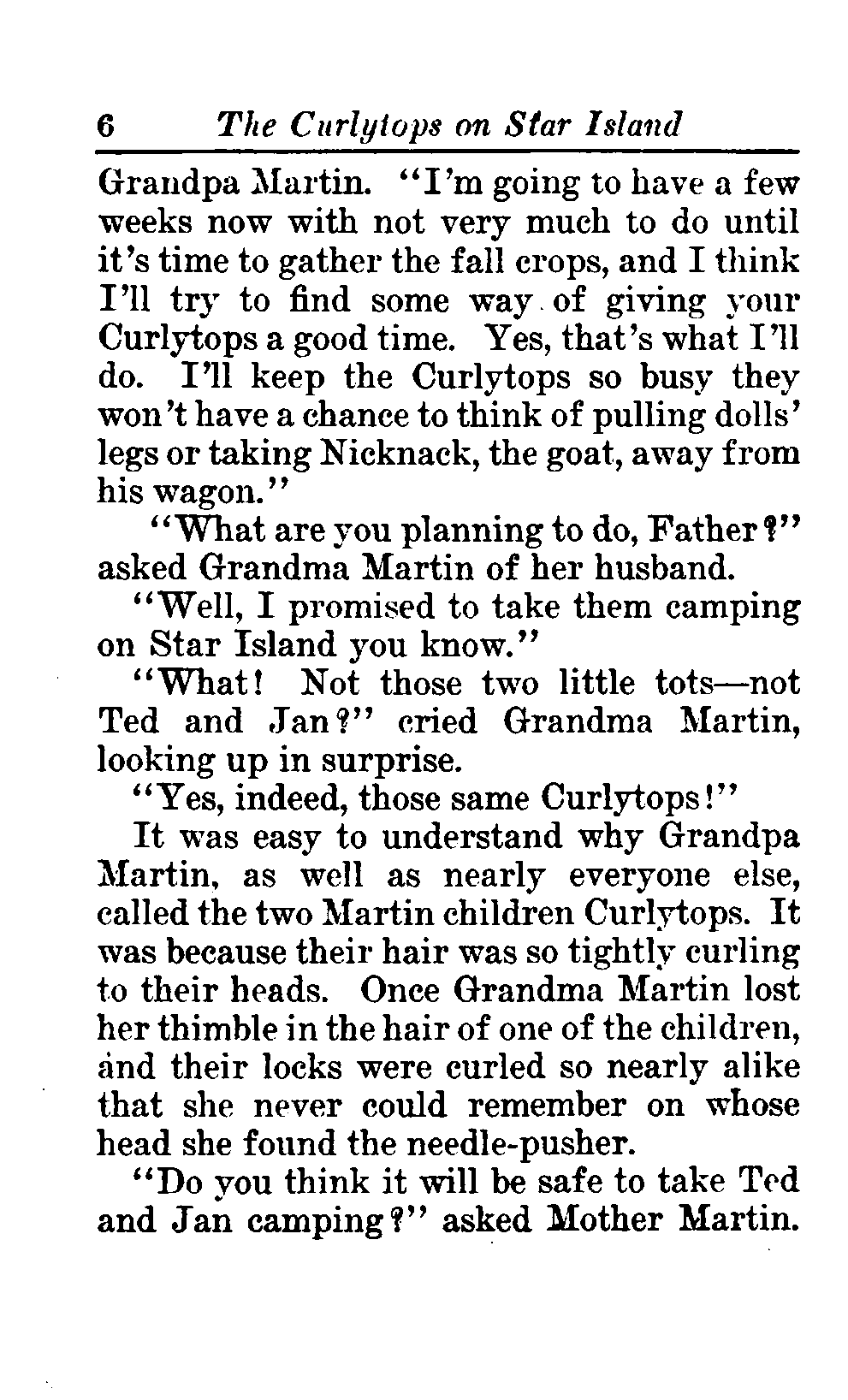 The opening of the novel introduces the Curlytops' playful dynamic, highlighting their bickering and imaginative play. After some amusing interactions, their grandfather reveals plans to take them camping on Star Island, igniting their excitement. As speculations arise about a strange blue light seen on the island, tension builds regarding the potential presence of tramps, which adds an element of mystery and adventure to their trip. This sets the stage for a delightful exploration of childhood curiosity, playful sibling rivalry, and the thrill of camping adventures. (This is an automatically generated summary.)