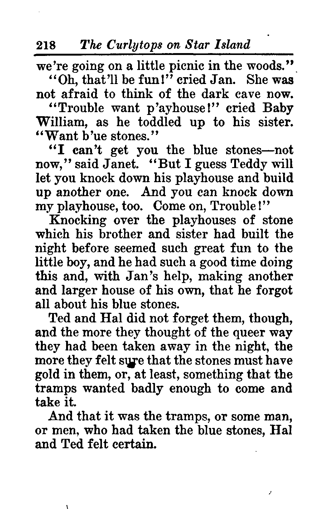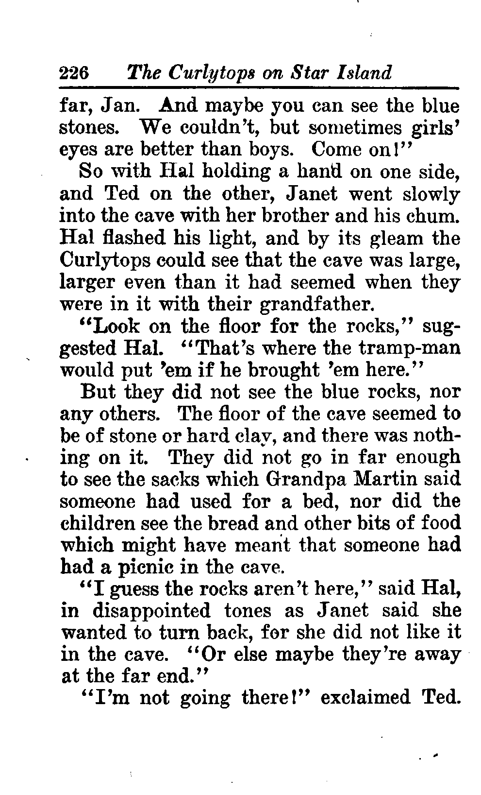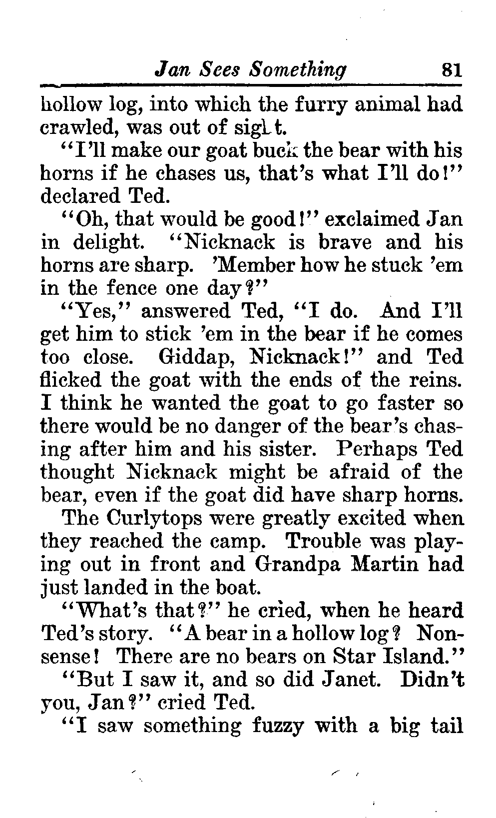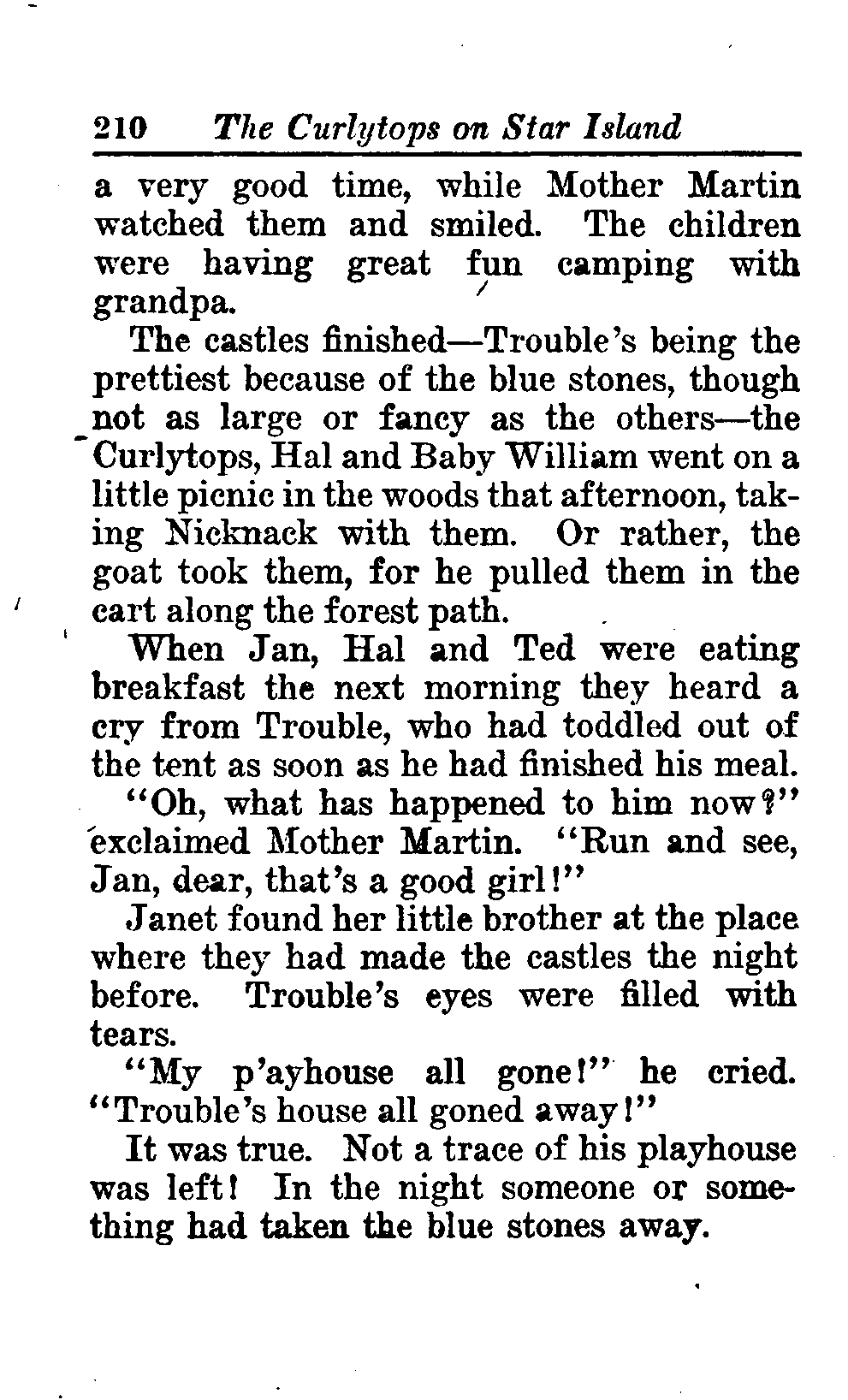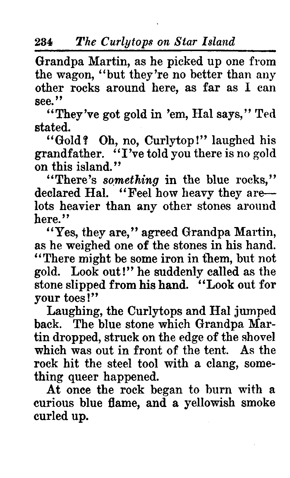 The opening of the novel introduces the Curlytops' playful dynamic, highlighting their bickering and imaginative play. After some amusing interactions, their grandfather reveals plans to take them camping on Star Island, igniting their excitement. As speculations arise about a strange blue light seen on the island, tension builds regarding the potential presence of tramps, which adds an element of mystery and adventure to their trip. This sets the stage for a delightful exploration of childhood curiosity, playful sibling rivalry, and the thrill of camping adventures. (This is an automatically generated summary.)