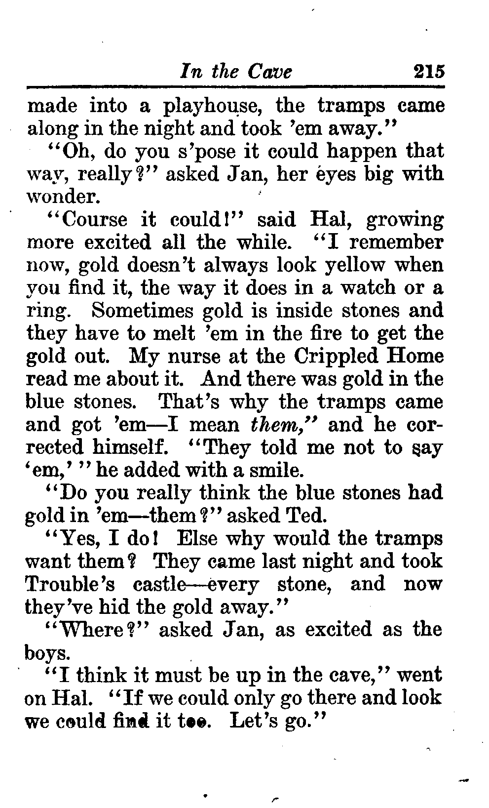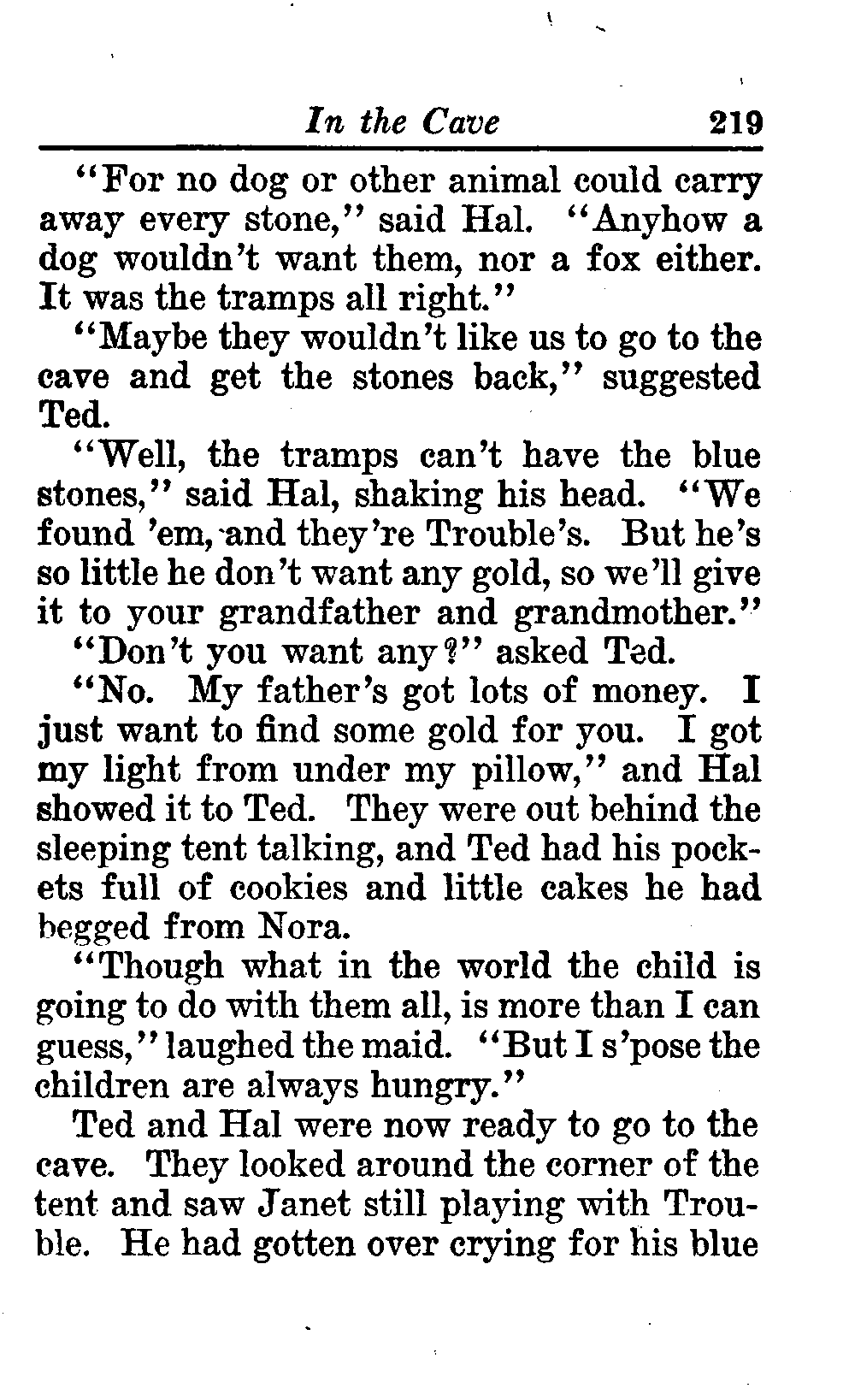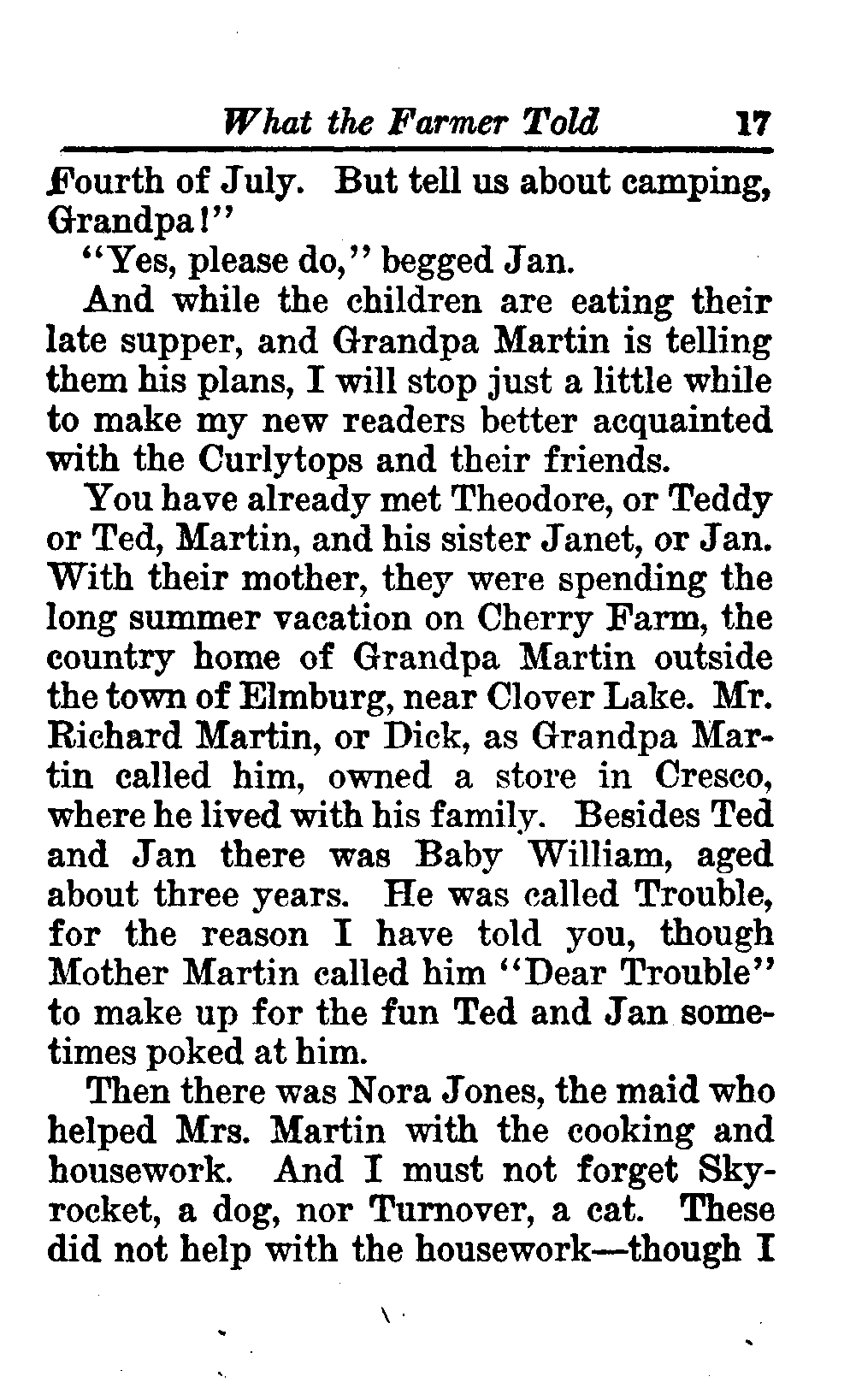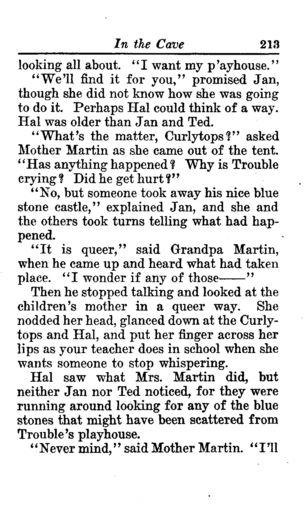The opening of the novel introduces the Curlytops' playful dynamic, highlighting their bickering and imaginative play. After some amusing interactions, their grandfather reveals plans to take them camping on Star Island, igniting their excitement. As speculations arise about a strange blue light seen on the island, tension builds regarding the potential presence of tramps, which adds an element of mystery and adventure to their trip. This sets the stage for a delightful exploration of childhood curiosity, playful sibling rivalry, and the thrill of camping adventures. (This is an automatically generated summary.)