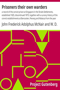"Prisoners Their Own Warders" by Major J. R. A. McNair is a historical account written in the late 19th century. The work documents the convict prison system at Singapore, detailing its establishment in 1825 and subsequent operations until its closure in 1873, while also providing insights into related convict establishments at Bencoolen, Penang, and Malacca. The author delves into the management, treatment, and contributions of Indian convicts within this penal system, exploring