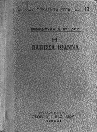 "Η Πάπισσα Ιωάννα" by Emmanouel D. Rhoides is a novel published in 1866. The work tells the story of Joanna, a woman who disguised herself as a man and rose through the ranks of the Roman Catholic Church to become Pope. Based on the medieval legend of Pope Joan, who allegedly reigned from 855 to 858, the novel caused immediate controversy. The Greek Orthodox Church condemned it as "anti-Christian and malicious," sparking