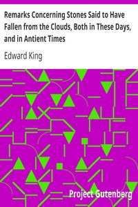 occurrences of falling stones. In the book, Edward King examines various accounts of showers of stones, particularly highlighting the bizarre event in Tuscany, where multiple stones fell from a cloud, alongside various witnesses to the event. King discusses the composition and characteristics of these stones, including their weight, appearance, and chemical properties. He also reviews similar historical incidents from antiquity, arguing that such events have been documented throughout history. Through careful observation and analysis, King suggests that these stones may have been formed in the atmosphere due to volcanic activity, while also entertaining the idea that such phenomena are not as rare as they might seem. Ultimately, the text serves as both a detailed investigation of a specific occurrence and a broader inquiry into the nature of geological formations and their historical significance. (This is an automatically generated summary.)