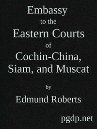 "Embassy to the Eastern Courts of Cochin-China, Siam, and Muscat" by Edmund Roberts is a historical account written in the early 19th century. The narrative chronicles the author's experiences as a special envoy on a diplomatic mission to the courts of Cochin-China, Siam, and Muscat, aimed at establishing equitable trade relations for American commerce in those regions. Through detailed observations and interactions with various cultures, Roberts provides insight into the political and