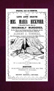 The Life and Death of Mrs. Maria Bickford A beautiful female, who was inhumanly murdered, in the moral and religious city of Boston, on the night of the 27th of October, 1845, by Albert J. Tirrell, her paramour, arrested on board the Ship Sultana, off New Orleans, December 6th |