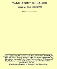 "Talk about Socialism with an old shopmate" by Anonymous is a theological pamphlet written in the 19th century. This work reflects on the conversations between two old shopmates, addressing the topic of Socialism and its contradictions to Christian teachings. The book presents a dialogue format that emphasizes the virtues of faith, morality, and the importance of religion in guiding human conduct, contrasting these with the views espoused by Socialist ideologies prevalent during