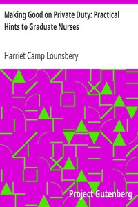 "Making Good on Private Duty: Practical Hints to Graduate Nurses" by Harriet Camp Lounsbery is a guidebook for nursing professionals written in the early 20th century. The text offers practical advice on the nuances of private duty nursing, drawing on the author’s extensive experience and focusing on the importance of a compassionate approach to patient care, as well as the dynamics between nurses, patients, and their families. The opening portion of the