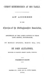 "Christ Remembered at His Table" by John Alexander is an address delivered in 1854, falling within the mid-19th century. This religious publication focuses on the significance of the Lord’s Supper, reflecting on its importance as a memorial of Christ’s death. The address aims to instruct members of the Christian community on the deeper meanings and implications of commemorating the sacrifice of Jesus Christ at the Communion table. In the address, Alexander emphasizes the need to remember Christ's dual nature as both divine and human while reflecting specifically on the significance of His sacrificial death. He discusses the emotions and principles evoked by this remembrance, arguing that such contemplation encourages believers to approach Jesus as sinners, stirs penitential feelings, and cultivates love for Christ and one another. Ultimately, the address serves as a guide for believers to engage spiritually during the Lord's Supper, viewing it as a vital connection to their faith and an encouragement to embody Christ’s teachings in their lives. Alexander concludes by highlighting the future hope of Christ's return, reinforcing the continuity of faith when participating in this sacred act. (This is an automatically generated summary.)
