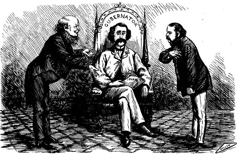 NOT JUST YET! Mr. Greeley. "PRAY, TAKE A SEAT, MR. WOODFORD; I WOULDN'T ON ANY ACCOUNT DEPRIVE YOU," etc., etc. Mr. Woodford. "No! NO!—TAKE IT YOURSELF, MR. GREELEY; THE LAST THING I SHOULD THINK OF WOULD BE," etc., etc. Governor Hoffman. "DON'T TROUBLE YOURSELVES, GENTLEMEN: I SHALL PROBABLY CONTINUE TO OCCUPY THE CHAIR FOR A COUPLE OF YEARS, YET." COMIC ZOOLOGY. Genus, Phoca.—The Seal. This is the common name of the inoffensive and fur-bearing members of the Phocidæ family. The word seal is derived, radically, from the German Siegel, so that to say a man has "fought mit SIEGEL," is equivalent to remarking that he has assailed a harmless and timid seal. The Phocidæ, without distinction of sex, are known as Mammafers, although it would manifestly be more correct to call the males Papafers. Under the present classification, the confusion of genders necessarily engenders confusion. Unless AGASSIZ is gassing us, the true seal has no sign of an ear, wherefore the deafening roar of the surf in which it delights to sport is probably no inconvenience to it. As distinguished from dumb beasts in general, it may properly be called a deaf and dumb animal. The false seal, on the contrary, has as true an ear as e'er was seen. To the counterfeits belong the sea lion, the Mane specimen of the tribe in the Arctic sea, and the sea leopard, which seems to be phocalized in the Antarctic circle. All the varieties of the seal seek concealment in caverns, and their Hides are much sought after. Sealing was at one time chiefly monopolized by adventurous New Englanders, who combined the pursuit with whaling, but at present the sealers of Salt Lake bear off the palm from all competitors, both as regards numbers and hardihood. Whether they combine whaling with sealing is not positively known, but probably they do. Such is the universal passion for sealing among the people of that region, that the old men act like Young men when engaged in this exciting occupation. The Phocidæ appear to have attracted the attention of Mankind at a very early period—Seals being frequently spoken of in the Scriptures. St. JOHN witnessed the opening of no less than seven varieties, and must have been well acquainted with their internal structure. The earless, or true species, are often seen in considerable numbers on the British coast, and the Great Seal of England—only to be found in the vicinity of the Thames—is of such remarkable size and weight, that it never makes its appearance without producing a strong Impression. The Green Seal, a much admired variety, is peculiar to Madeira, and seals of various colors are often seen in close proximity to the British. Ports; the number taken off Cork being prodigious. None of the animals of the Phoca genus are tenacious of life. They may readily be destroyed with sealing whacks. A large stick properly applied has been known to seal the fate of a dozen in the space of half an hour. KANE knocked them over without difficulty, and they never attempt to defend themselves, according to PANEY. In conclusion, it may be remarked that immense herds of seals cover the coasts of Alaska. It is nevertheless difficult to catch a glimpse of them, on account of the enormous flocks of humming birds, which darken the air in that genial clime. Occasionally, however, the Arctic zephyrs disperse the feathery cloud, and then vast numbers of the timid creatures, with a sprinkling of the Walrus, may be seen by looking in a Se(a)ward direction. A LITTLE ACKNOWLEDGMENT. The Free (and Easy) Press has honored PUNCHINELLO with a brief as well as premature obituary paragraph. Flattered as he is by being thus noticed in the columns of a journal of the long standing and well sustained popularity of the Free (and Easy) Press, it pains PUNCHINELLO to be obliged to state that he still lives, and that he is not only alive, but kicking. That he has come to an end, is true—but it is to the end of his First Volume, as the F. (and E.) Press can see by turning to the admirably written, dashing, humorous, and absolutely unsurpassable Index appended to our present number, which Index PUNCHINELLO cordially recommends to the perusal of the F. (and E.) Press. The Preface to his Second Volume, however, which is now in preparation, will, PUNCHINELLO confidently assures the F. (and E.) Press, be altogether superior to the Index to his First. Let the F. (and E.) Press look out for it. But, meanwhile, the F. (and E.) Press can cheer itself by frequent contemplation of the entertaining personage who serves as tail-piece to the Index, and whose gesture is of that familiar and suggestive kind that will doubtless be thoroughly understood by the F. (and E.) Press, and, as PUNCHINELLO hopes, fully appreciated.