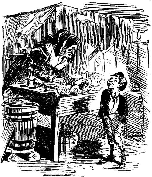 1870, by the PUNCHINELLO PUBLISHING COMPANY, THE MYSTERY OF MR. E. DROOD. AN ADAPTATION. BY ORPHEUS C. KERR. CHAPTER XXV. THE SKELETON IS MCLAUGHLIN'S CLOSET. Night, spotted with stars, like a black leopard, crouched once more upon Bumsteadville, and her one eye to be seen in profile, the moon, glared upon the helpless place with something of a cat's nocturnal stare of glassy vision for a stupefied mouse. Midnight had come with its twelve tinkling drops more of opiate, to deepen the stupor of all things almost unto death, and still the light shone luridly through the window-curtains of Mr. BUMSTEAD'S room, and still the lonely musician sat stiffly at a dinner-table spread for three, whereof only a goblet, a curious antique black bottle, a bowl of sugar, a saucer of lemon-slices, a decanter of water, and a saucer of cloves appeared to have been used by the solitary diner. Unconscious that, through the door ajar at his back, a pair of vigilant human orbs were upon him, the ritualistic organist, who was in very low spirits, drew an emaciated and rather unsteady hand repeatedly across his perspiring brow, and talked in deep bass to himself. "He came in, af'r' bein' brisgly walked up'n-down the turnpike by PENDRAGON, and slammed himself down-'n-that-chair," ran the soliloquy, with a ghostly nod towards an opposite chair, drawn back from the table. "'Inebrious boy!' says I, sternly, 'how-are-y'-now?' He said 'Poorawell;' 'n' wen' down on-er-floor fas'hleep! I w's scan'l'ized.—Whowoonbe?—I took m' umbrella 'n' thrashed 'm with it, remarking 'F'shame! waygup! mis'able boy! 's poorysight-f'r-'nuncle-t' see-'s-nephew-'n-this-p'litical-c'ndit'n.'—H'slep on; 'n' 't last I picked up him, 'n' umbrella, 'n' took 'm out t' some cool place t'shleep't off. Where'd' I take him? Thashwazmarrer—where'd' I leave'm?" Repeating this question to himself, with an almost frenzied intensity, the gloomy victim of a treacherous memory threw an unearthly stare of bloodshot questioning all over the room, and, after a swaying motion or two of the upper half of his body, pitched forward, with his forehead crashing upon the table. Instantly recovering himself, and starting to rub his head, he as suddenly checked that palliative process by a wild run to his feet and a hideous bellow. "I r'memb'r, now!" he ejaculated, walking excitedly at a series of obtuse angles all over the apartment. "Got-'t-knockedinto-m'-head-'t-last. Pauper bur'l ground—J. M'GLAUGHLIN. Down'n cellar—cool placefa' man's tight—lef' m' umbrella there by m'stake—go'n' get't thishmin't—" Managing, after several inaccurate aims at the doorway, to plunge into the adjacent bedroom, he presently reappeared from thence, veering hard-aport, with a lighted lantern in his right hand. Then, circuitously approaching the neglected dining-table, he grasped with his disengaged digits at the antique black bottle, missed it, went all the way around the board before he could stop himself, clutched and missed again, went clear around once more, and finally effected the capture. "Th 'peared t' be two," he muttered, placing the prize in one of his pockets; and, with a triumphant stride, made for the half-open hall-door through which the eyes had been watching him. The owner of those eyes, and of a surprising head of florid hair, had barely time to draw back into the shadow of the corridor and notice an approaching face like that of one walking in his sleep, when the clove-eater swung disjointedly by him, with jingling lantern, and went fiercely bumping down the stairway. Closely, without sound, followed the watcher, and the two, like man and shadow, went out from the house into the quarry of the moon-eyed black leopard. Fully bound now in the sinister spell of the spice of the Molucca islands, Mr. BUMSTEAD had regained that condition of his duplex existence to which belonged the disposition he had made of his lethargic nephew and alpaca umbrella on that confused Christmas night; and with such realization of a distinct duality came back to him at least a partial recollection of where he had put the cherished two. Finding Mr. E. DROOD rather overcome by the more festive features of the meal,—notwithstanding his walk at midnight with Mr. PENDRAGON,—he had allowed his avuncular displeasure thereat to betray itself in a threshing administered with the umbrella. Observing that the young man still slept beside the chair from which he fell, he had ultimately, and with the umbrella still under his arm raised the dishevelled nephew head-downward in his arms, and impatiently conveyed him from the heated room and house to the coolest retreat he could think of. There depositing him, and, in his hurry, the umbrella also, to sleep off, under reviving atmospheric influences, the unseemly effect of the evening's banquet, he had gone back on both sides of the road to his boarding-house, and, with his boots upon the pillow, sunk into an instantaneous sleep of unfathomable depth. Dreaming, towards morning, that he was engaging a large boa-constrictor in single combat, and struggling energetically to restrain the ferocious reptile from getting into his boots, he had suddenly awakened, with a crash, upon the floor—to miss his umbrella and nephew, to forget where he had put them, and to fly to Gospeler's Gulch with incoherent charges of larceny and manslaughter. All this he could now vaguely recall, his present psychological condition, or trance-state, being the same as then; and was going entrancedly back to the hiding-place where, with the best of motives, he had forgetfully left the two objects dearest to him in life. On, then, proceeded the Ritualistic organist in the tawny light of the black leopard's eye: his stealthy follower trailing closely after in the shade of the roadside trees where the star-spotted leopard's black paws were plunged deepest. On he went, in zig-zag profusion of steps and occasional high skips over incidental shadows of branches which he for sna