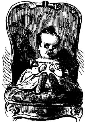 NONE THE BETTER FOR TOO MUCH NURSING. Dr. W.G. Bryant.—"MR. KELLEY, THAT POOR CHILD PENNSYLVANIA HAS BEEN FED TOO EXCLUSIVELY WITH PIG-IRON PAP. SUPPOSE YOU TRY SOME OF MY FREE-TRADE MIXTURE, AND SEE IF THAT WON'T RESTORE IT TO HEALTH." HIRAM GREEN SURPRISED. His Fellow-Citizens Present Him with a Silver Tea Service. When the Hon. BILL SOOWARD allers gets home from a voyige, the sitezens of Auburn give him a warm recepshen. When Goyenor HOFFMAN visits the home of his childhood days, a spontaneous bust of friendship throws her lovin embrace about him. When a few sundry other peeple, whose names shall be nameless in this communication, have arroven to their long home on tother side of the River Sticks, they will get a recepshen so warm, that, settin on top a red hot koal stove and sokin their feet in a kittle full of b'iling water, will be full as cheerin to 'em as a Mint Jewlip is to an inhabitant of the Equinoxial line. Recepshens and presentashens bein the order of the day, I took it into my head, a short time since, to have my feller sitizens of Skeansboro' give me some of it. Consekently I hired 1/2 dozen of my nabors, whom I supposed wouldent make turnal fools of their selves, to call at the Old Green manshon with a crowd of peeple, at the hour when I was supposed to be to bed, for the purpuss of presentin me with a silver tea sarvice, which our Joowiler had lent me for the occasion. I writ up an impromptu speech, and practiced it for over a week, out in my barn, so as to be reddy for the cerprise. My 3 oldest darters had agreed to be dressed up in white, representen the 3 graces—Faith, Hope, & Charity—and arrangin their selfs in a tabloo in the back parler, they was to throw open the foldin doors at a signal from me. I also tride to get my wife to rig up; says she: "Me rig up? No, sir! I wouldent encourage sich a lot of tom foolery to save your consarned neck. And I know of a sartin Old Noosants who'l ketch Hail Columbia if he musses up these ere parlers to freely." The noosants referred to was no doubt the undersined; I know it was. Mariar was allers full of pet names, and this was one of them. When she called me pet names, I dident stop to argue with her. It is no use; shee'l allers have the last word, if she sets up all nite for a week for it. You mite just as well try to make Bosting fokes think the hul United States don't resolve around Masserchussetts Bay and Bosting Common once every 24 times an hour, as to undertake to stop a womans clack when she gets on a talkin fit. The appinted nite came, and I was standin behind the winder curten, peekin out the upper hall winder, anxiusly awaitin the arrival of the crowd. All of a sudden a percession, hove in site, headed by a drum and fife. Their onsartin way of marchin, by gettin their legs mixed all up together, made me think that by the time they got up to my house, the painful duty would devolve on to me of goin down and getten their legs ontangled. The fifer was continually mistakin his head for a drum stick, as he fell over and let it strike vilently agin the sheep skin head of the base drum. Whilst the drummer, hisself, was mistakin evry bodys head for his musikle instrument, as he dealt out blows rite and left, to all who come within hittin distance of his intossicated drum sticks. Arrivin before my domisil, the leeder sung out and says: "Now boys (hic!) let's rattle up bald head, (hic!) if old 2-and-ninepence don't (hic!) shell out with his 'freshments, we'll (hic!) smash this 'ere borrered tea sarvice over his (hic!) figger head." Sayin which he gives the door bell a yank, which was enuff to pull the roof off from over our heads. Slippin on my red nite cap, I poked my head out of my winder, and in fained cerprise, Bays to 'em: "My good peeple, what's the meanin of this demon-stration?" "A lot of fellers, who you hired to come and pay you a visit, has got here. So come down and let us in, old hoss," says a voice. I went down stairs, with doubts in my mind as to the way the thing would turn out. Unboltin the door, the assemblige filed in. A casual glance convinced me that I was not receivin into the buzzum of my family manshon a deputashun from the Skeensboro Lodge of Good Templers, for a skalier lot of whiskey-soked human beins I never sot eyes on. There was JOB BIGLER, who useter leed the Skeensboro brick meetin house quire, tryin to pick his teeth with the corner of a pictur-frame, while standin before the lookin glass was WILLYAM DUNBAR vainly endevorin to ascertain if he was the Siameese Twins, or else was the lookin-glass a double-plated one. Old JIM SPENCER insisted on standin with his cow-hide butes on top the mahogony senter table, for the purpuss of presentin me with the tea sarvice, while his son-in-law had no sorter hesitation, whatsomever, of planten his muddy feet into my wife's work basket, which was settin on a stool in the sou'-west corner of the front room. Others had piled theirselfs in heeps, in various parts of the room, presentin a picter which JOHN B. GOFF could work up to sich an affectin pitch, that tears could be got out of the eyes of a perfessional grave-digger. "SQUIRE GREEN, yer (hic!) feller sitisens, wishin to do the square thing by you, hereby (hic!) take this opportunity of presentin you with this (hic!) tea sarvice, which you hired down to GRIZ'LES jooliry (hic!) store, for this momentous occassion. Take it and be 'appy. Now trot out yer (hic!) benzeen," says SPENCER. At this pint I give the signle, and the foldin doors was throde quickly open, revealin my 3 gals in a classic tabloo. I then said: "Feller Sitizens: When I say I'me hily pleased at this onexpected cerprise, I but reiterate the pent up feelins of an overflowin heart."— "Oh, cork up on that ere spoutin, and sound yer supper bell," said JOE BIGLER, interuptin me. I again went on. "As I casts my eyes about me, I see the smillen faces of my feller sitizens, who have been tride and not found wantin—" "That's a lie! We are wa