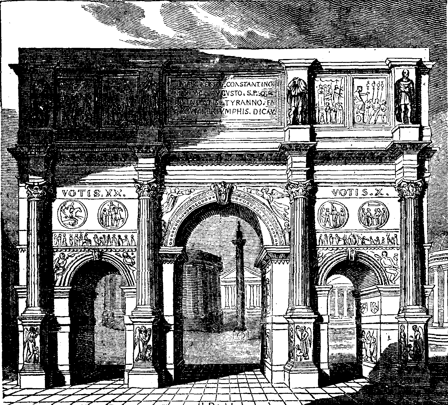 Although erected to the honour of Constantine, this arch commemorates the victories of Trajan, some of the basso-relievos, &c. having been pilfered from one of the arches of Trajan. This accounts for the Dacian captives, whose heads Lorenzo de Medicis broke off and conveyed to Florence, but the theft might not have been so notorious to posterity, had not the artists of Constantine's time added some figures of inferior merit. Forsyth says, "Constantine's reign was notorious for architectural robbery;" and the styles of the two emperors, in the present arch, mar the harmony by their unsightly contrasts.