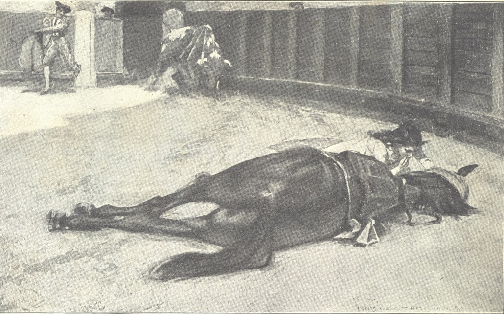 At the point which I had reached in a preceding paragraph of this account, the situation was as follows: two horses lay dying; the bull had scattered his persecutors for the moment, and stood raging, panting, pawing the dust in clouds over his back, when the man that had been wounded returned to the ring on a remount, a poor blindfolded wreck that yet had something ironically military about his bearing—and the next moment the bull had ripped him open and his bowls were dragging upon the ground: and the bull was charging his swarm of pests again. Then came pealing through the air a bugle-call that froze my blood—“It is I, Soldier—come!” I turned; Cathy was flying down through the massed people; she cleared the parapet at a bound, and sped towards that riderless horse, who staggered forward towards the remembered sound; but his strength failed, and he fell at her feet, she lavishing kisses upon him and sobbing, the house rising with one impulse, and white with horror! Before help could reach her the bull was back again—