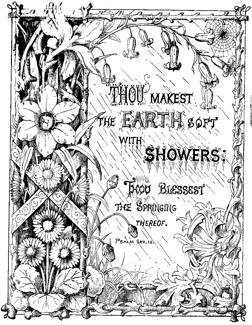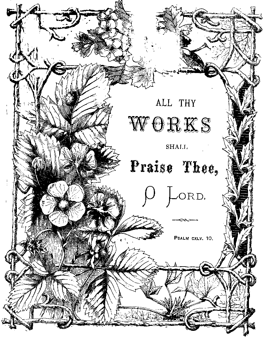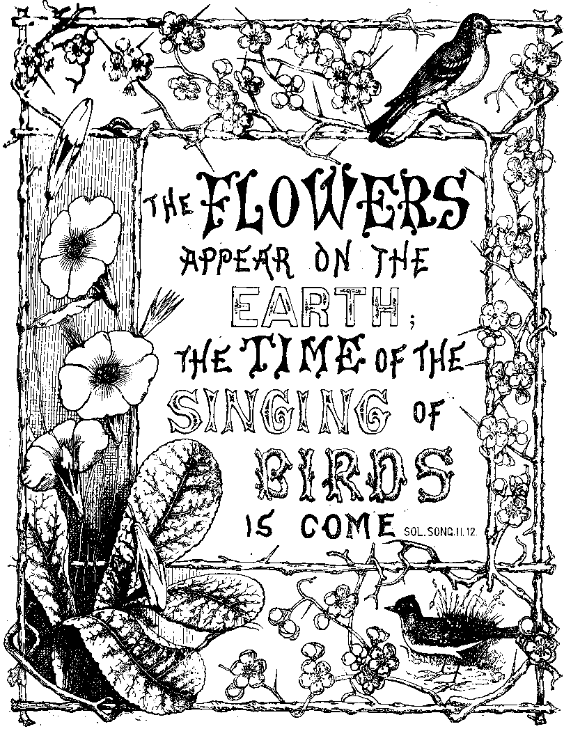 (SONG OF SOLOMON, ii. 12.) Now the win-ter cold is past, And blithe March winds are blow-ing, In shel-ter-ed nooks we find at last Bright flow-ers of spring are grow-ing. Along the hedge-row's mossy bank, Where ivy green is creep-ing, We see through weeds and net-tles rank The dark-blue vi-o-let peep-ing. And in the sun-ny gar-den beds Gay a-co-nites are show-ing, And snow-drops bend their grace-ful heads, And cro-cus-es are glow-ing. God makes the buds and leaves un-fold, All flow-ers are of His giv-ing; He guards them through the win-ter's cold, He cares for all things liv-ing. |