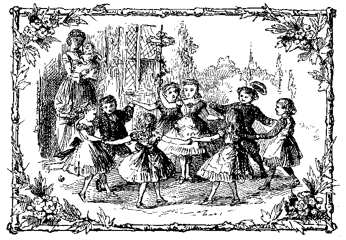 Round the May-pole, on the grass, Mer-ry lit-tle foot-steps pass; In the mid-dle Bes-sie stands, With the May-pole in her hands; While her play-mates dance and sing Round her in an end-less ring. Soon, in-deed, a feast they'll make, Cow-slip tea, with nice plum-cake— And so our leave of them we'll take. |