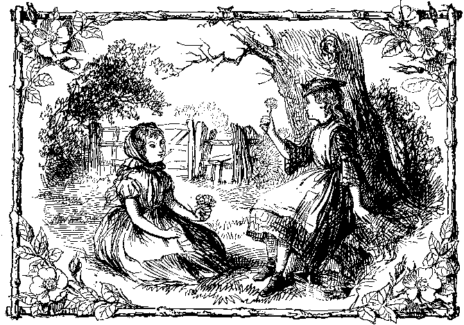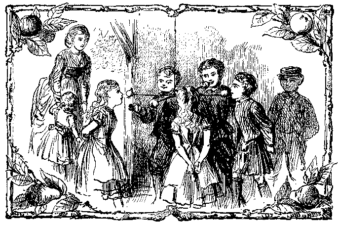 "Come, while it spins round, try your luck; Come, E-thel, and Kate, and your bro-thers! On two ends two ap-ples are stuck, And an on-ion on each of the o-thers. Be ready, and snap as they pass, Be quick, if you mean to be right, Or not the sweet ap-ples, a-las! 'Twill be, but the on-ions, you'll bite." |