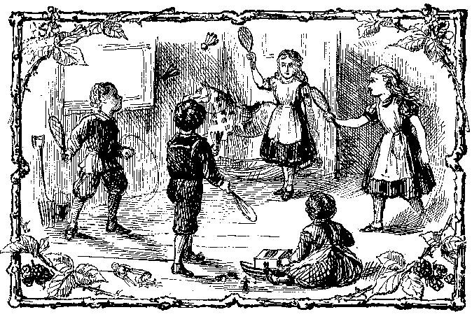 See these mer-ry chil-dren four, Now their les-son time is o'er, Deal-ing with the bat-tle-dore Steady blow on blow; Till the fea-thered shut-tle-cocks Fly at their al-ter-nate knocks, "Re-gu-lar as kitch-en clocks," Spin-ning to and fro. |