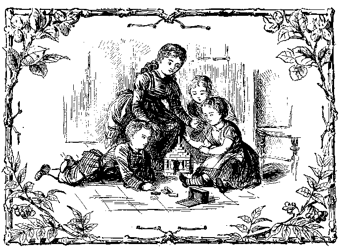 See these mer-ry ones at play, On this snowy New Year's Day: How they run, and jump, and throw Hand-fuls of the soft, white snow. You should hear them laugh and shout As they fling the snow about! 'Tis by Frank and Gus alone That the balls are chief-ly thrown, While their cou-sins make and bring Other balls for them to fling. Ka-tie is pre-par-ing thus, Quite a store of balls for Gus; But her mer-ry sis-ter May From her task has run a-way, All that heavy lump of snow, At her cou-sin Gus to throw. E-dith is not very bold, And at first she fear-ed the cold; Now at last you see her run Down the steps to join the fun. |